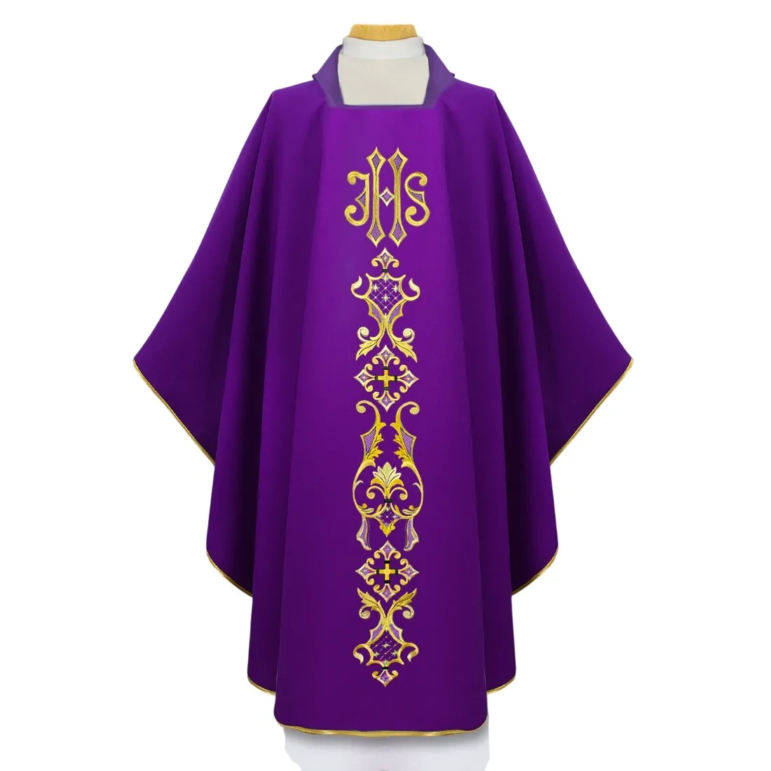 A Casula IHS – Roxo é confeccionada em tecido leve e agradável ao toque, proporcionando conforto ao celebrante. Apresenta bordado de alta qualidade em dourado, tanto na frente quanto no dorso: na frente, o monograma IHS em destaque com ramagens florais; e no dorso, um belíssimo desenho eucarístico com radiação dourada.