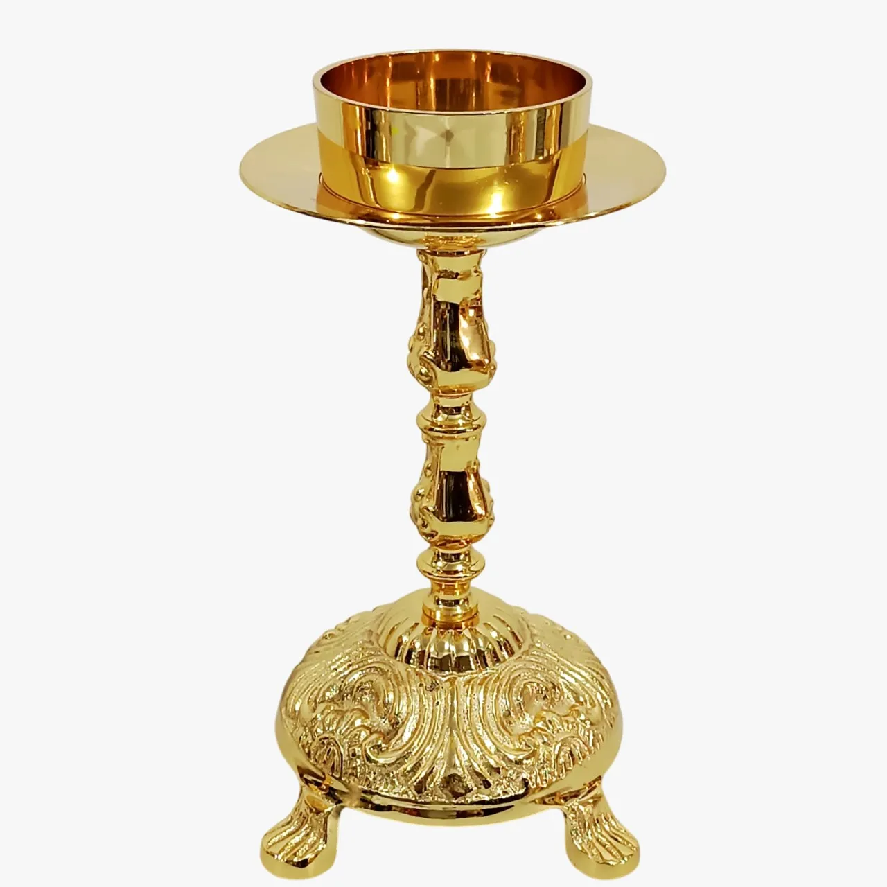 Castiçal 02 MÉDIO – Castiçal feito em latão fundido, polido e depois banhado a ouro. Resistente e belo. Para vela de até 7cm (vela de altar) de diâmetro – preferencialmente velas de fluído -.