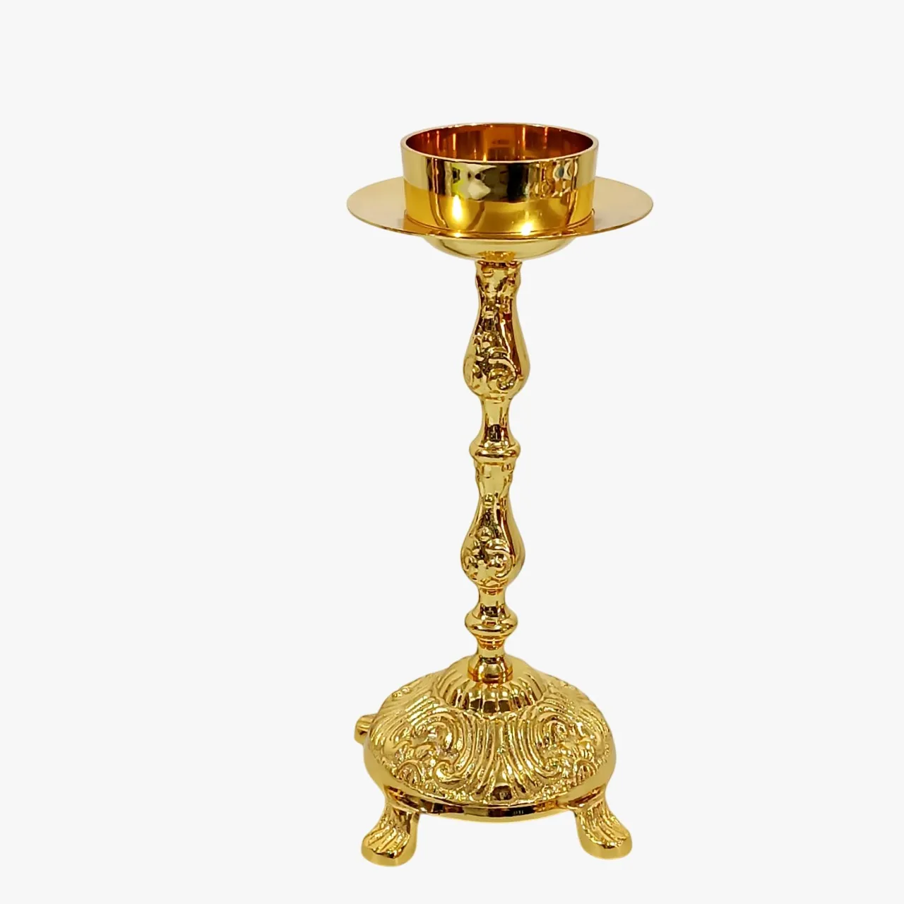 Castiçal 02 GRANDE – Castiçal feito em latão fundido, polido e depois banhado a ouro. Resistente e belo. Para vela de até 7cm (vela de altar) de diâmetro – preferencialmente velas de fluído -.