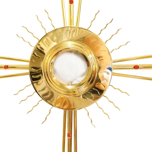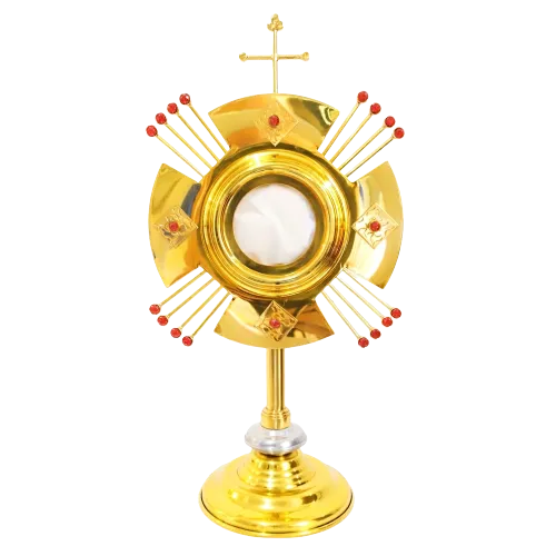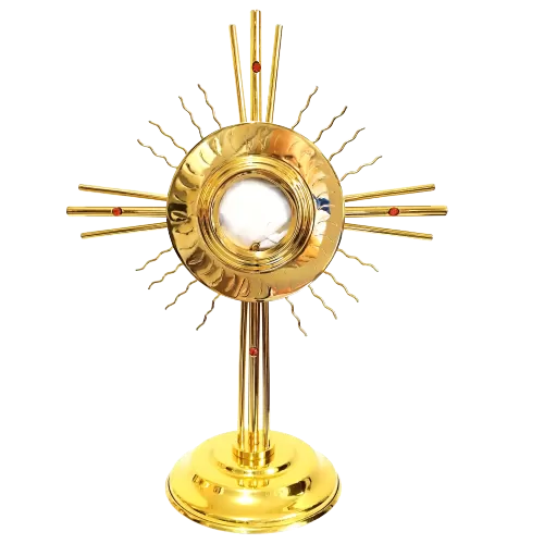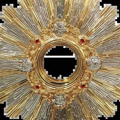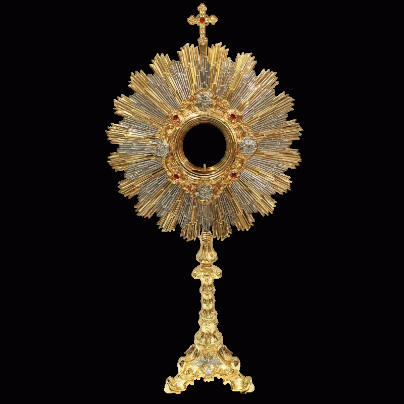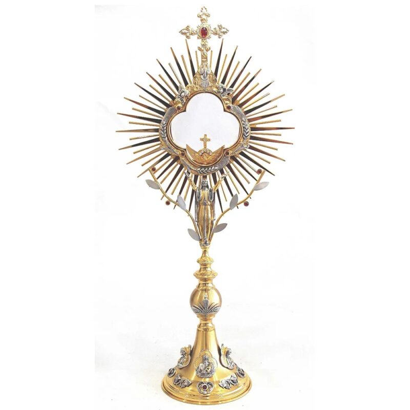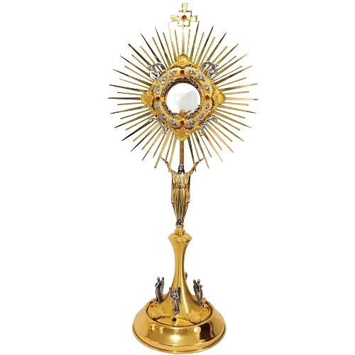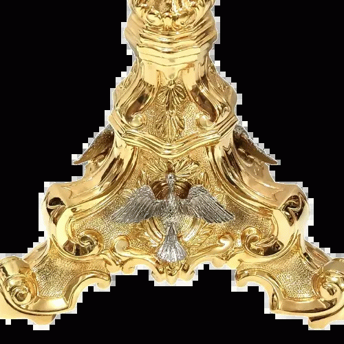 Um exemplo notável de arte sacra, especialmente pelo seu estilo barroco rococó, que é conhecido por sua opulência e detalhes ornamentais. A combinação de ouro 24k e prata é um indicativo de alta qualidade e luxo. O estilo barroco rococó é caracterizado por formas exuberantes e detalhadas, e a presença de anjos e pedras verdadeiras acrescenta um nível de sofisticação e beleza.
