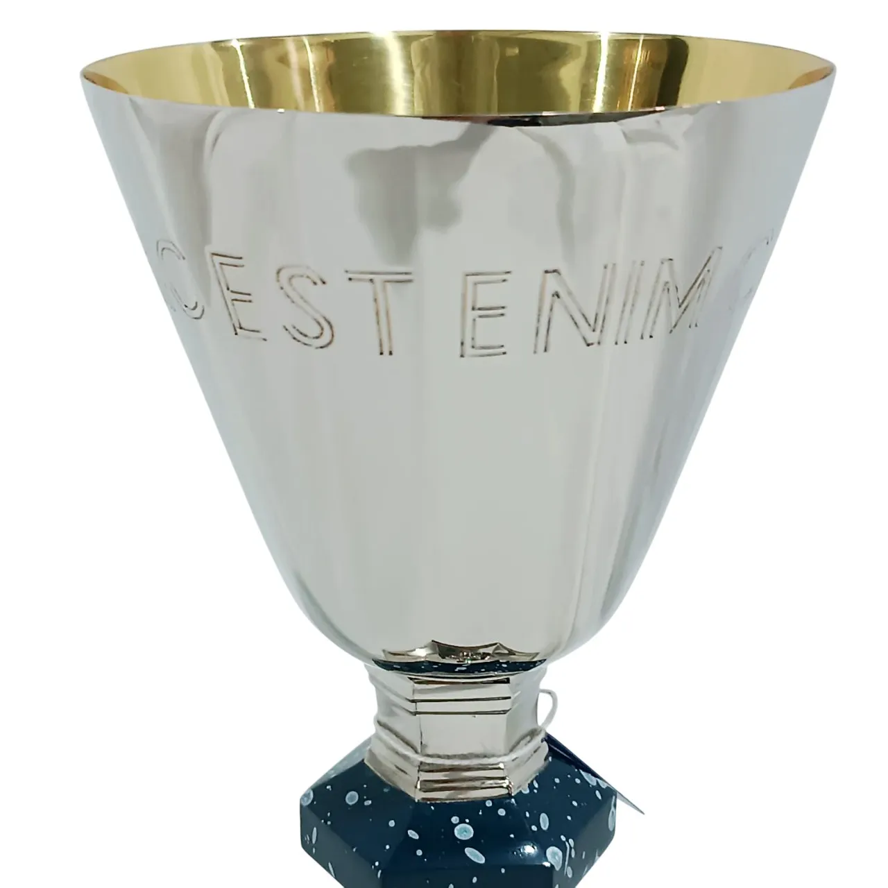 Cálice italiano “Sanguis Meum”, produzido em latão fundido com banho de níquel e interior dourado. Possui inscrição em latim na copa e cruz em relevo na base, com nó central esmaltado em azul, conferindo elegância e significado litúrgico à peça.