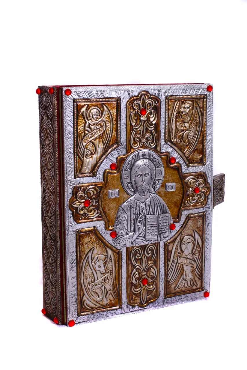 Capa para evangeliário em metal com banho em prata e dourado, pedras vermelhas e interior forrado com veludo.