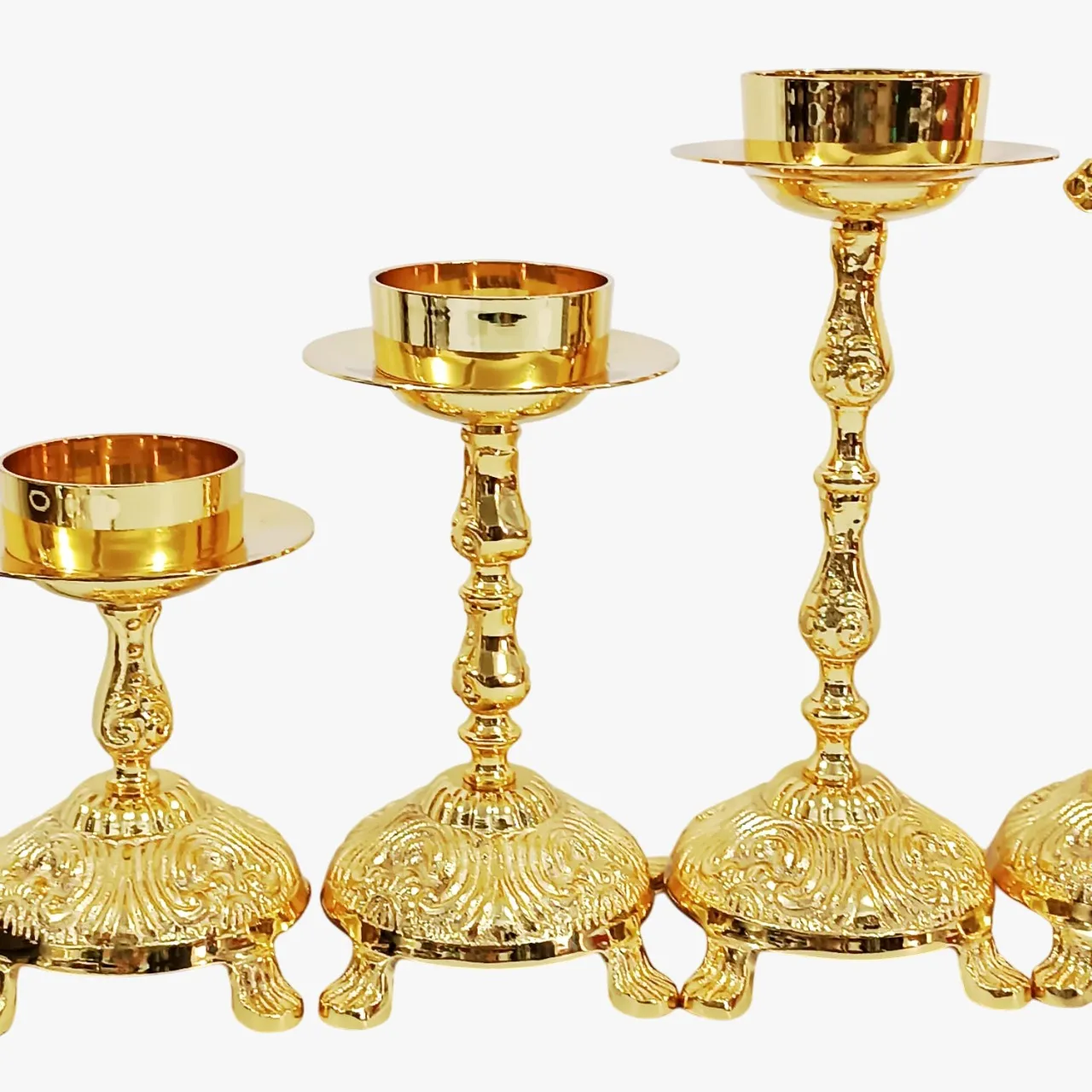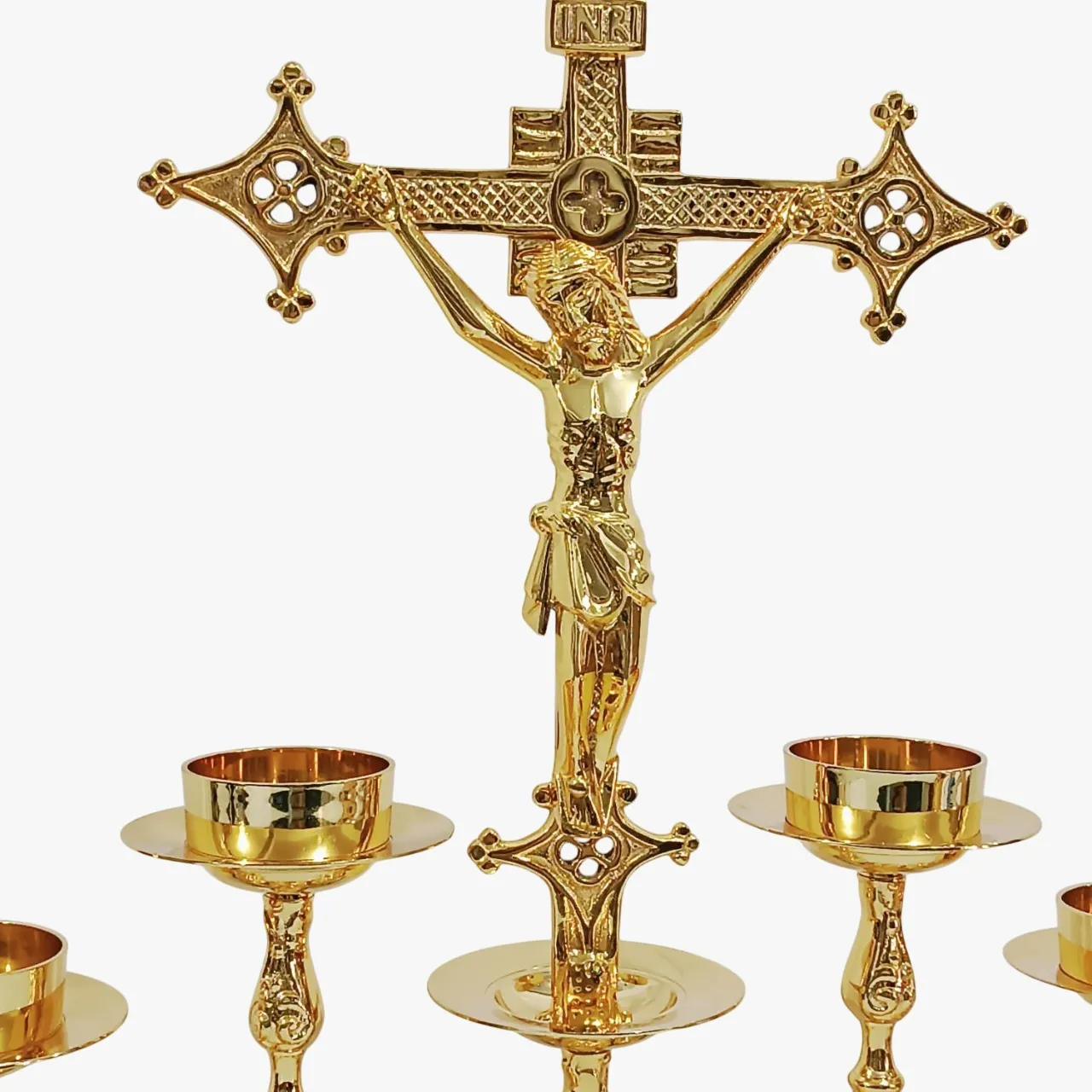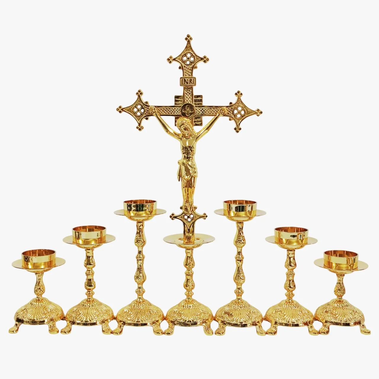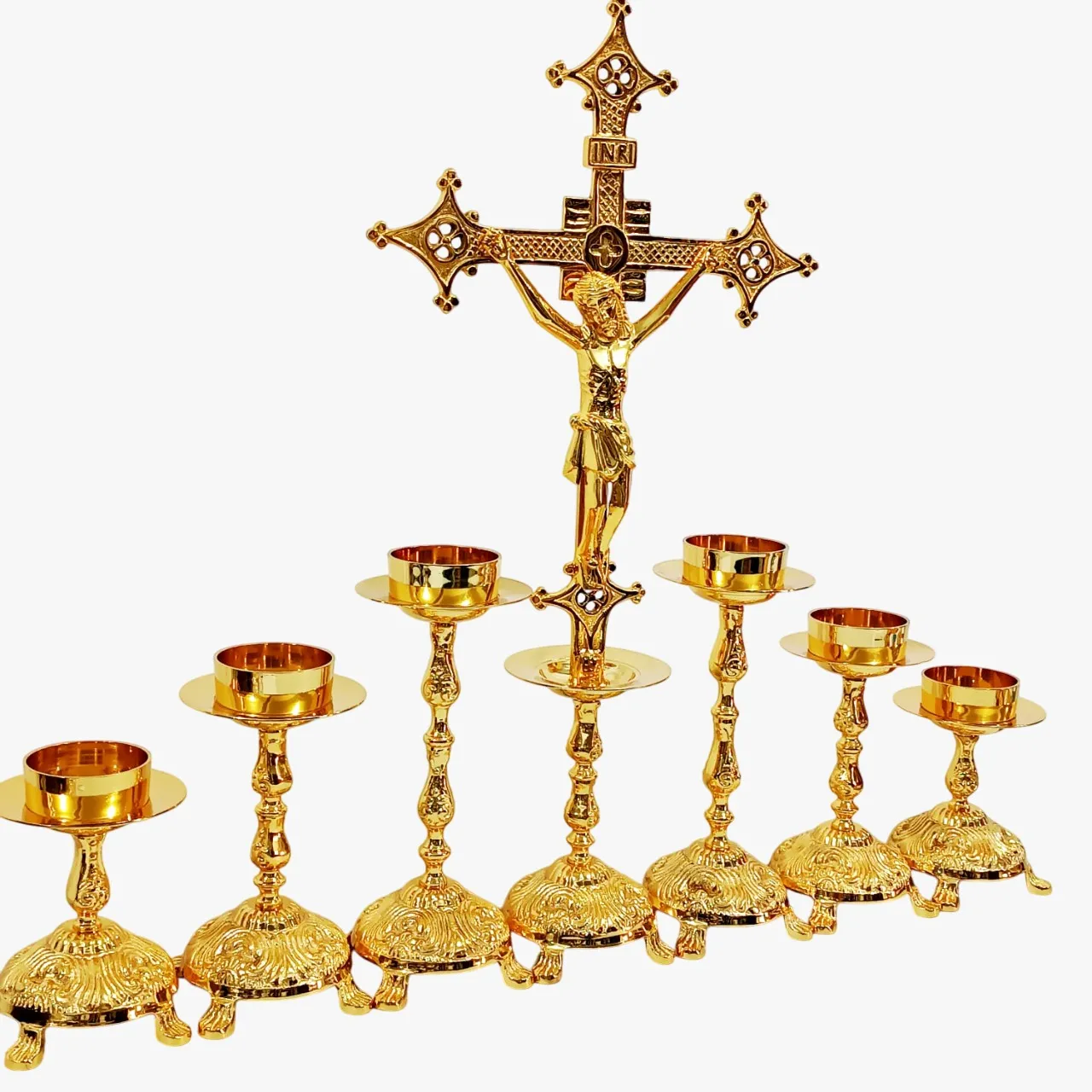 Conjunto contendo 6 castiçais banhados a ouro – 02 pequenos, 02 médios e 02 grandes – e uma cruz grande também banhada a ouro: feito em latão fundido, depois polido e banhado a ouro. Um conjunto resistente e belo. Para vela de até 7cm (vela de altar) de diâmetro. Aconselhamos o uso de velas de fluído.