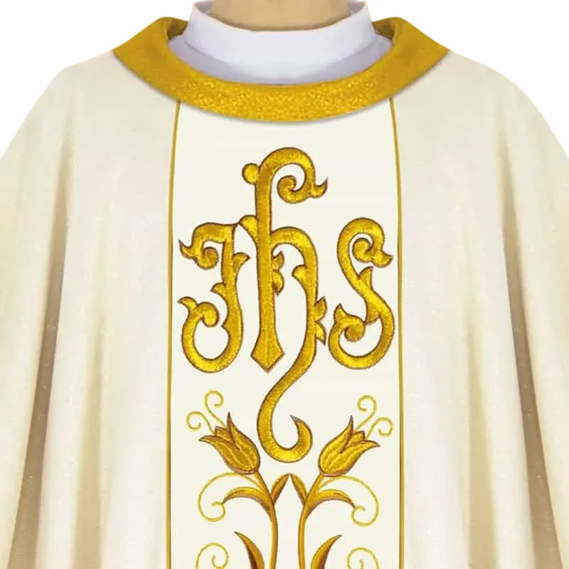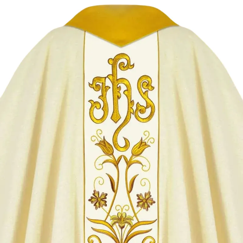 Casula gótica bordado em alto relevo com fios dourados e galão com detalhes finos.
