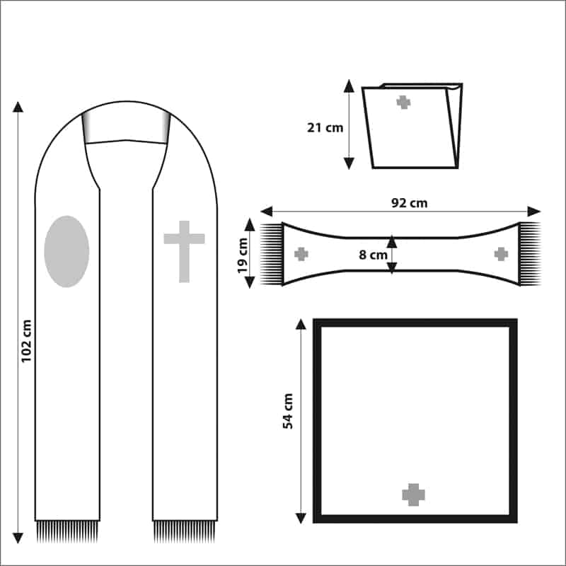 – frente 98cm (+-2cm) do ombro até a parte inferior da casula