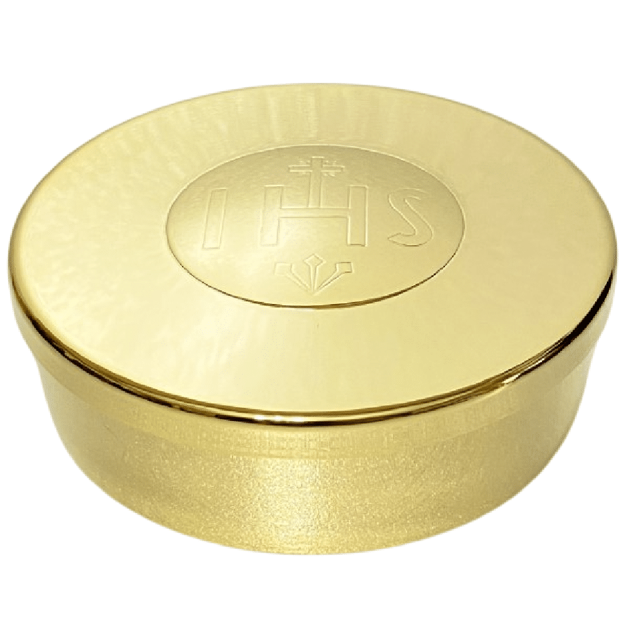 A Caixa para Hóstia Dourada é uma peça de alta qualidade e requinte, ideal para uso litúrgico em celebrações religiosas. Fabricada na Itália, esta caixa se destaca por seu acabamento em metal com banho de ouro 24k, conferindo-lhe um brilho e elegância excepcionais.
