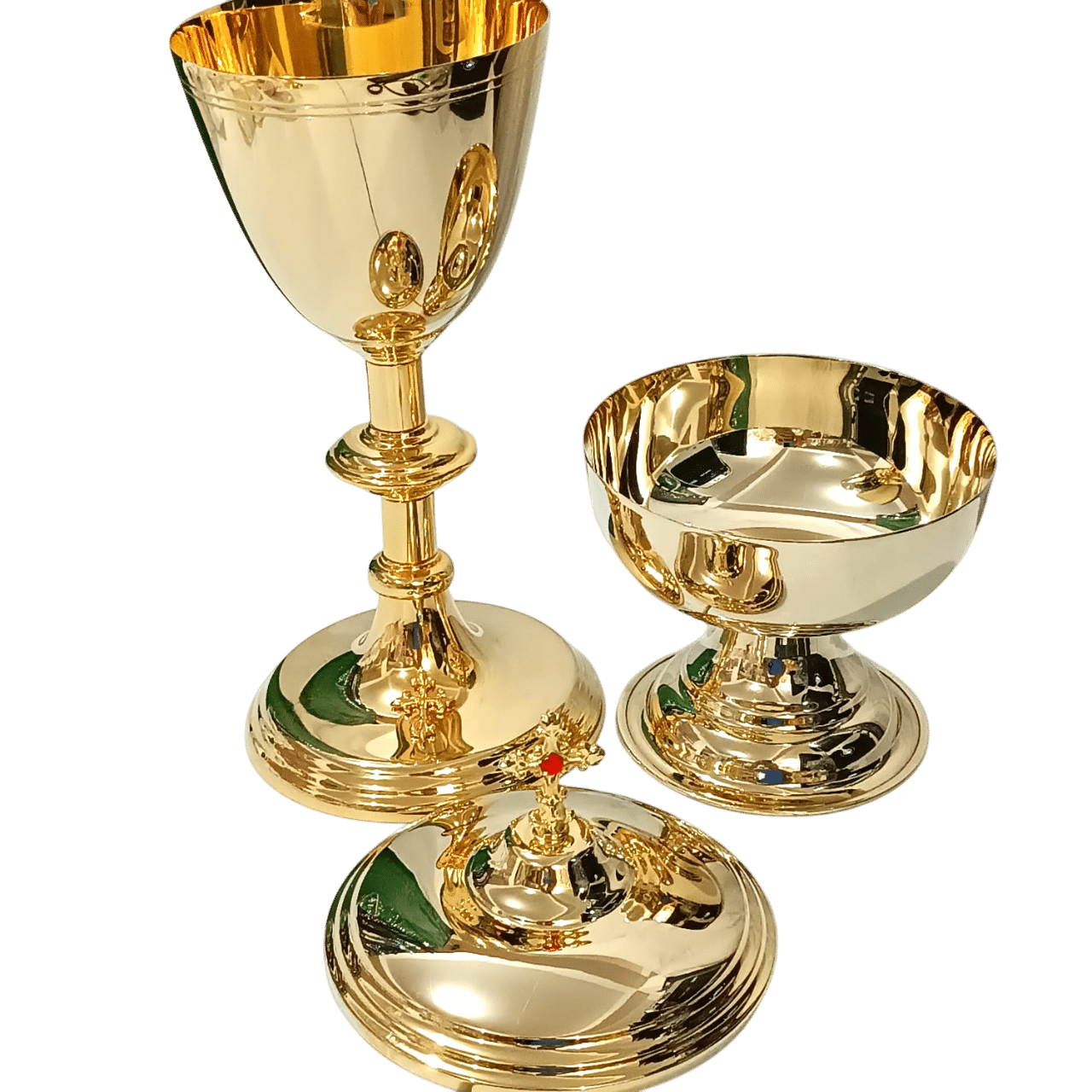 Âmbula e cálice produzida em liga metálica de latão com banho de ouro 24k. Polimento especial e verniz protetor