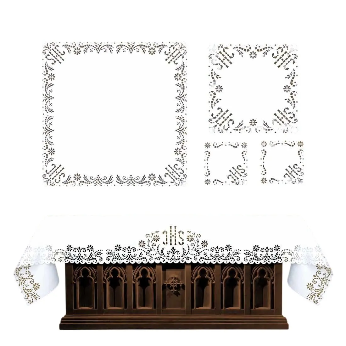 Conjunto de altar vazado a laser, feito em tecido se altíssima qualidade, resistente a manchas.