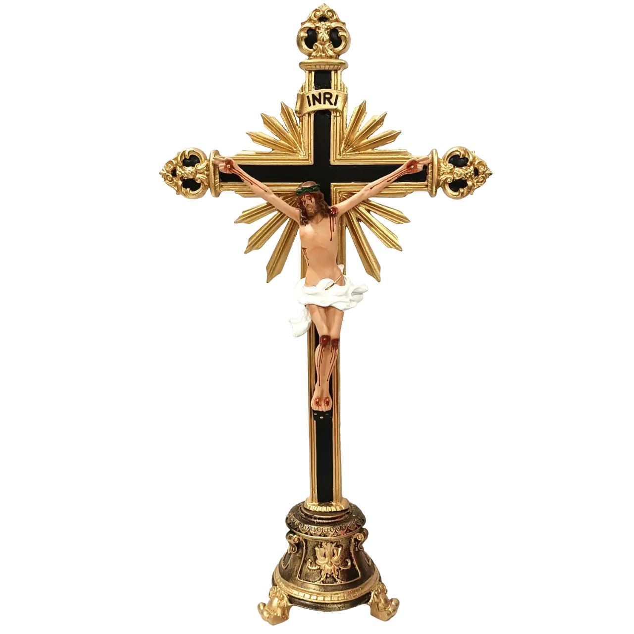 Crucifixo de Mesa Ornado Resina 59 cm. Fabricado em resina com base removível e com acabamento em pintura fina feita artesanalmente com tinta a base de água. Base removível. Imagem para ambiente interno.