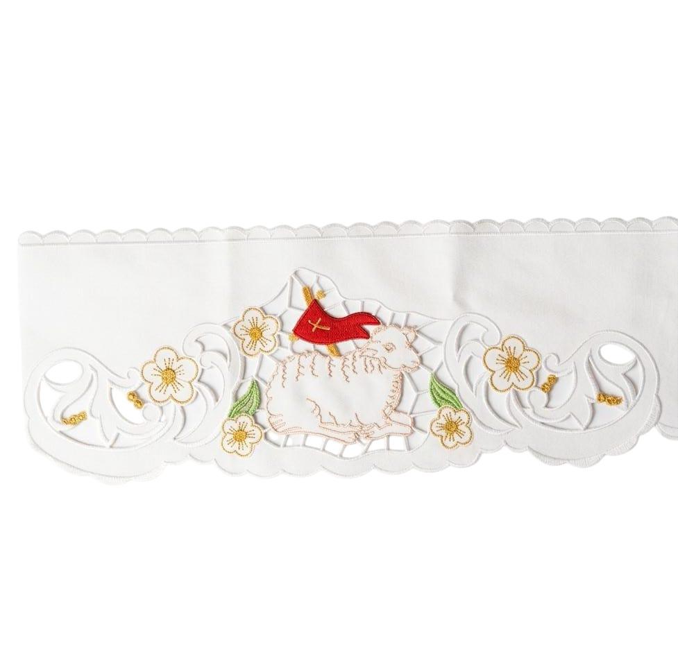 Renda para frente de altar (frontal de altar) confeccionada em tecido, impregnado e resistente a manchas, de alta qualidade. Totalmente bordado.