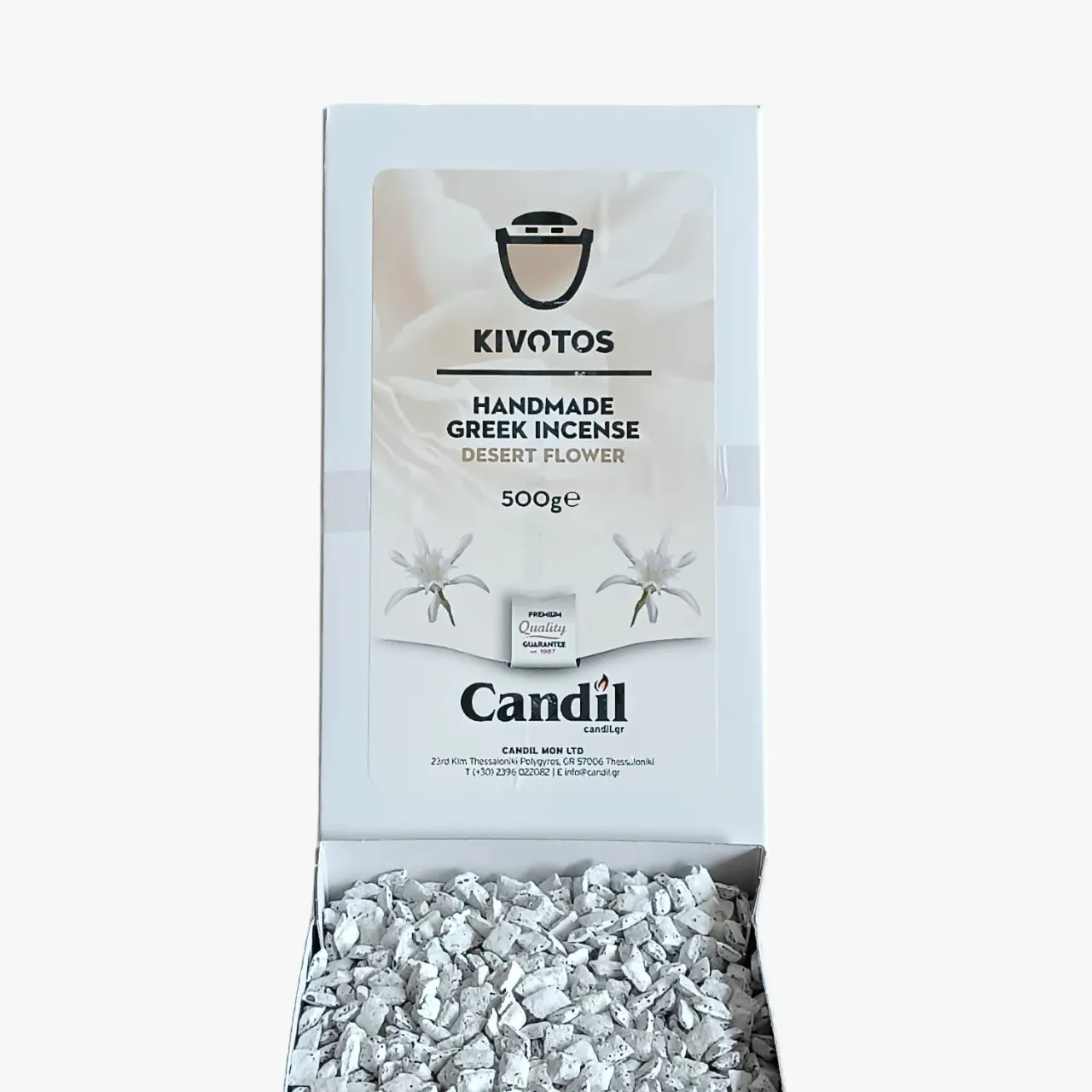Incenso Grego Desert Flower 500 gr é um incenso produzido a partir de técnicas desenvolvidas em mosteiros ortodoxos do sagrado Monte Athos, na Grécia.