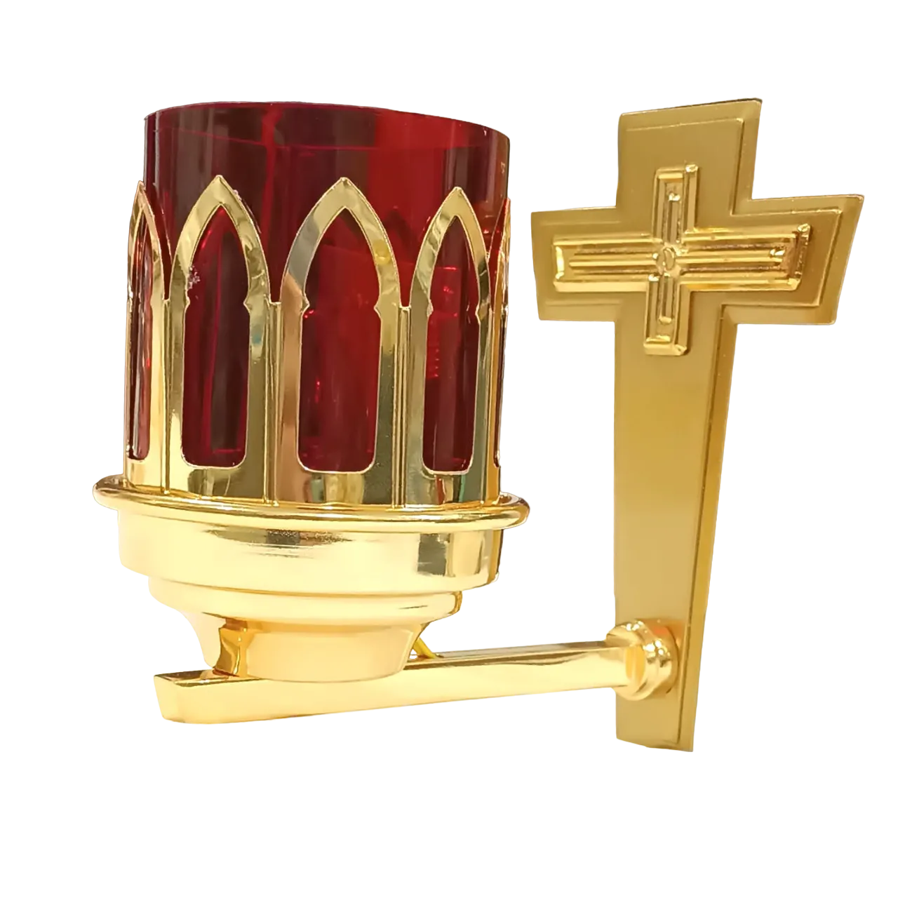 Lâmpada do Santíssimo modelo L003, fabricada em metal com banho dourado, com copo de acrílico. Acompanha fio e lâmpada E14, disponível em 110 ou 220 volts.