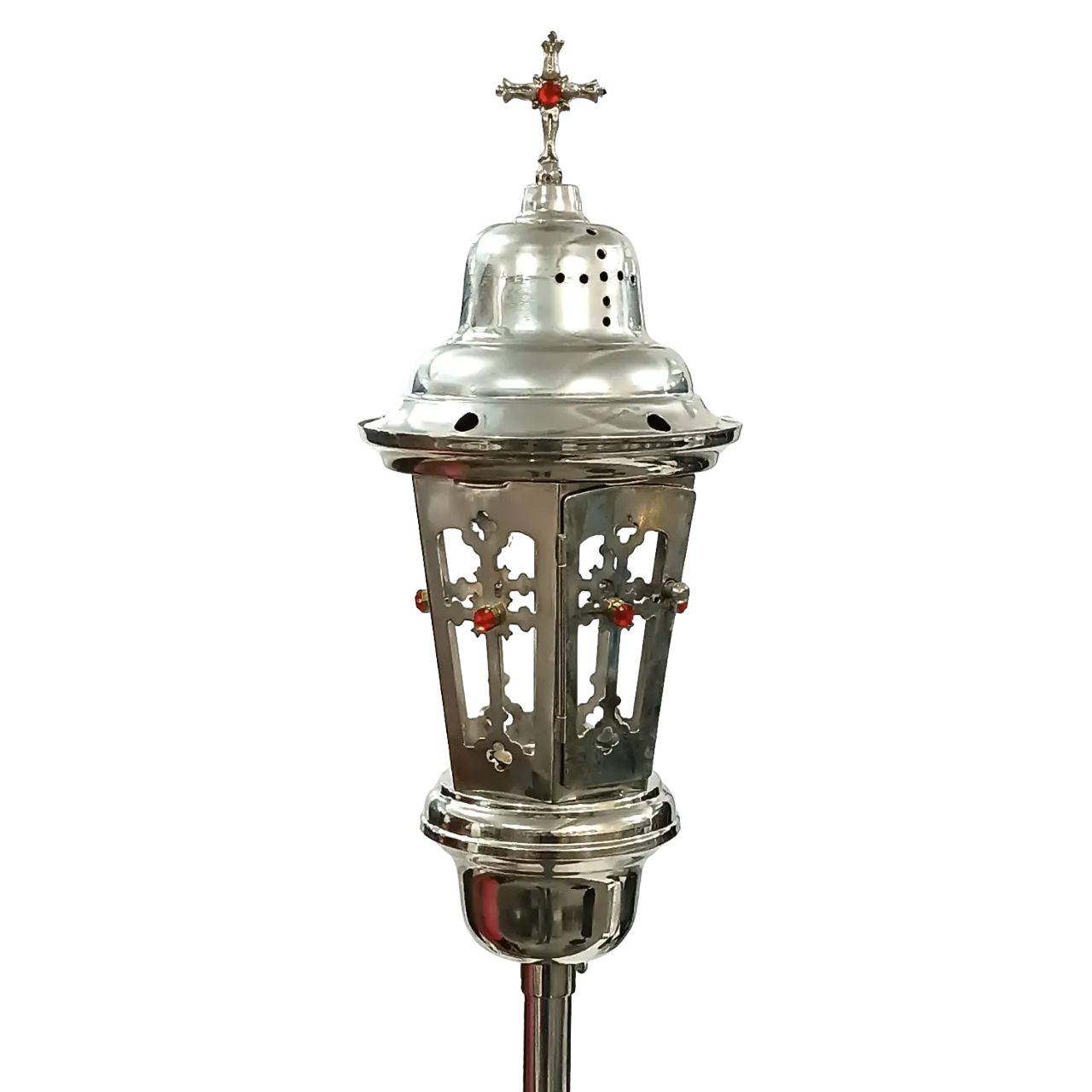 Parece que você está descrevendo um tocheiro processional, ideal para ser utilizado em procissões. Vou organizar e detalhar a descrição para facilitar a compreensão: