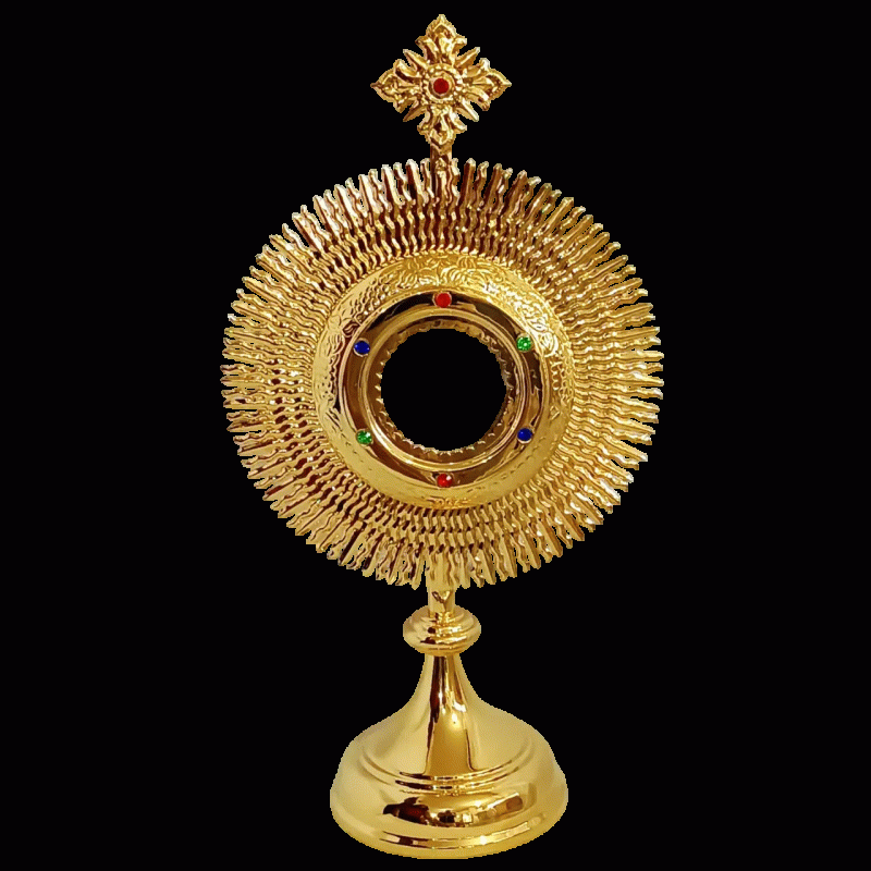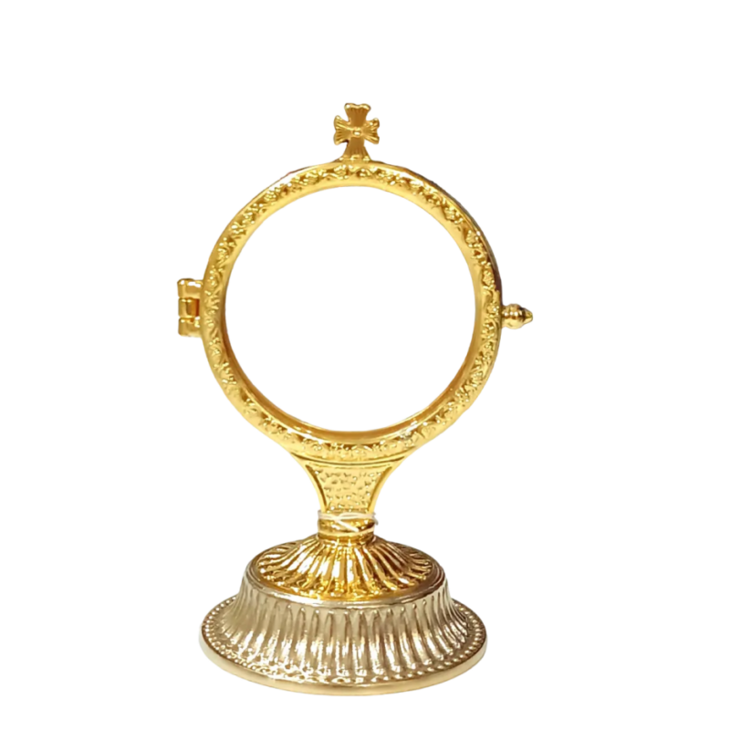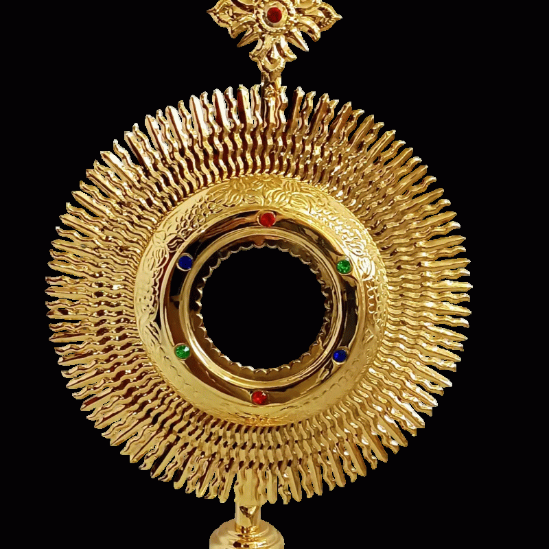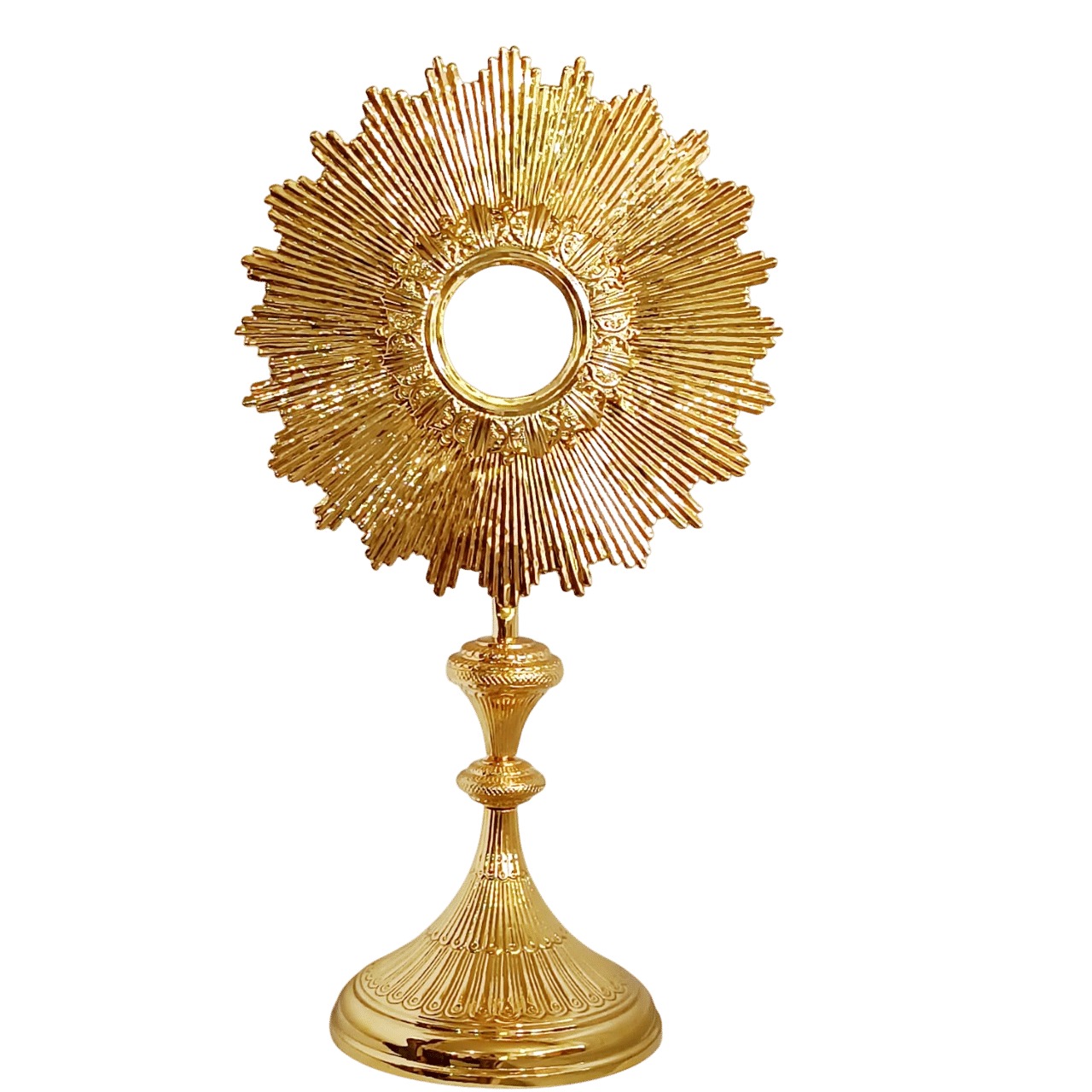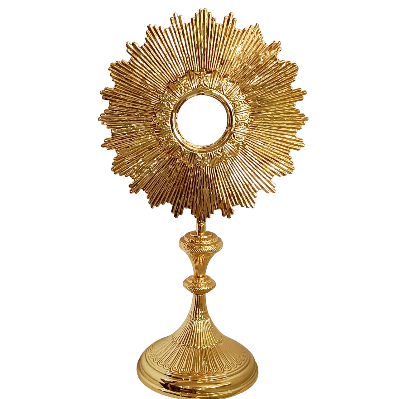 Uma peça litúrgica de grande beleza e simbolismo, o Ostensorio it15 é ideal para exposições eucarísticas e procissões. Produzido artesanalmente em latão de alta qualidade, com acabamento em banho de ouro 24k, que confere brilho intenso e proteção.