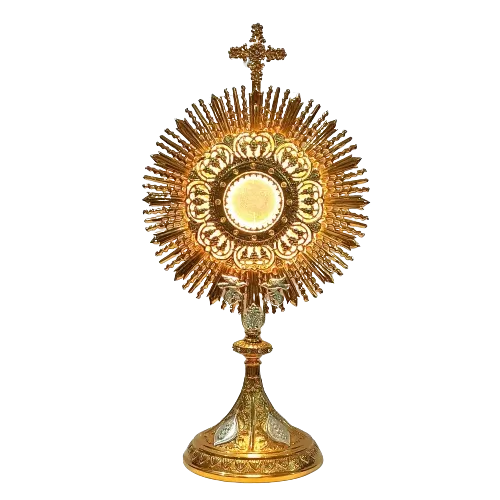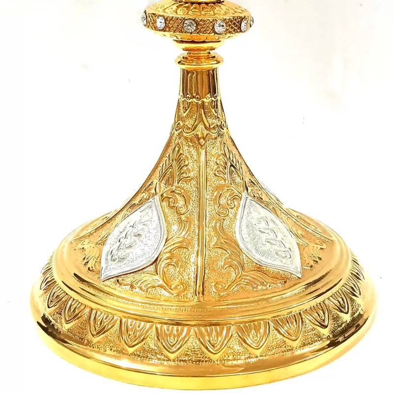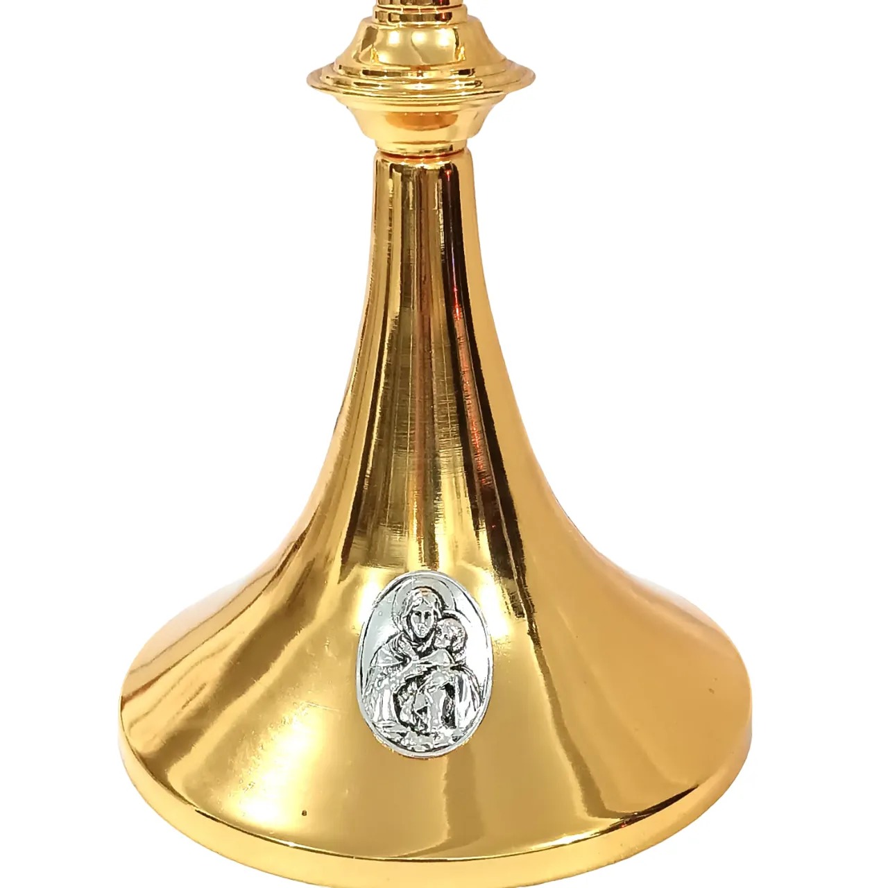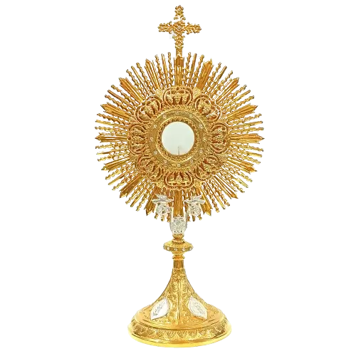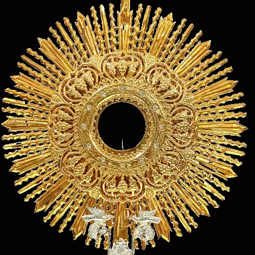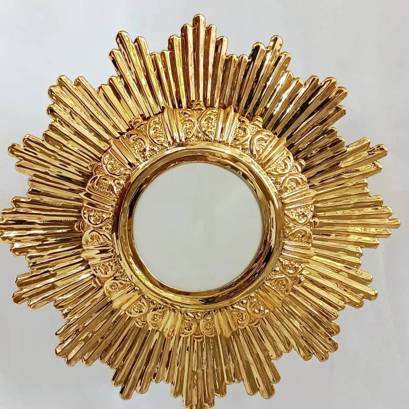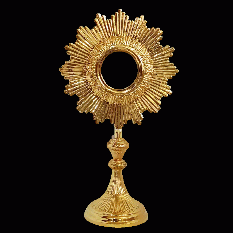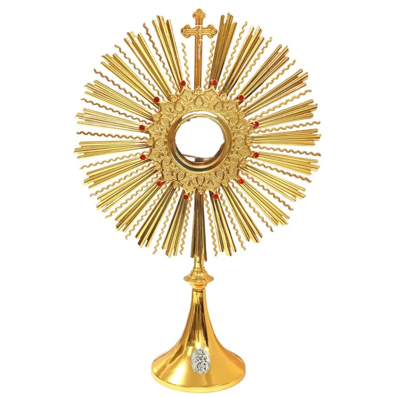 Ostensório estilo barroco, feito em latão com repuxo e cinzelado manualmente. Banhado a ouro 24k com apliques em níquel.