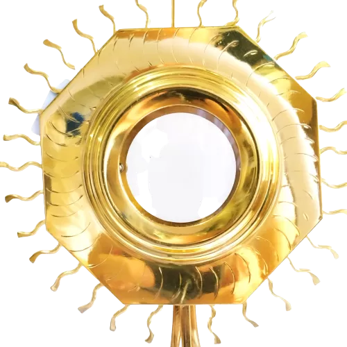 Ostensório. Ostensório estilo barroco, feito em estanho fundido e banhado a ouro 24k com apliques em níquel.