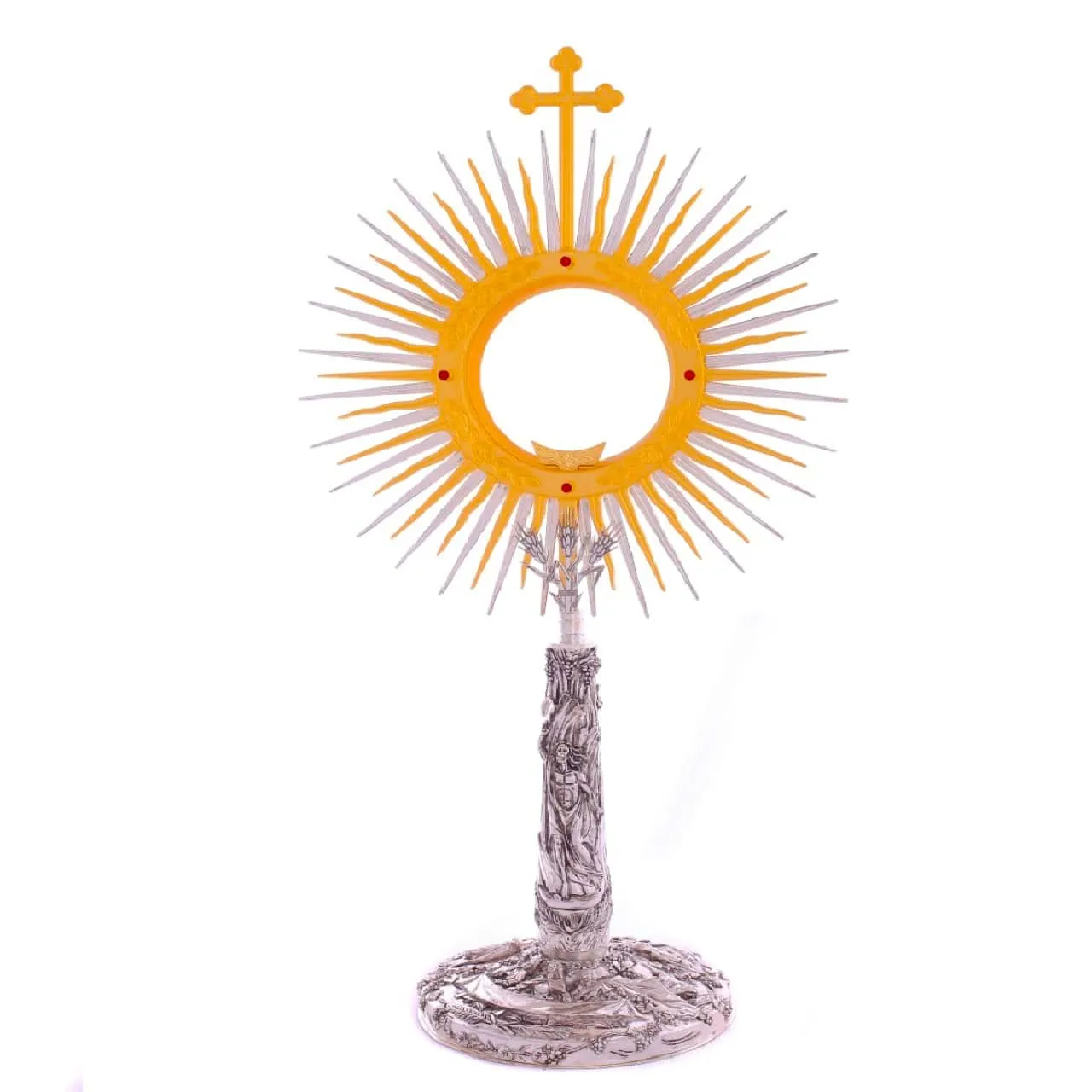 Ostensório. Ostensório estilo barroco, feito em latão e banhado a ouro e níquel. Base rica em detalhes, com a Santa Ceia, a representação dos evangelista e o Bom Pastor na coluna. RAIADA DUPLA