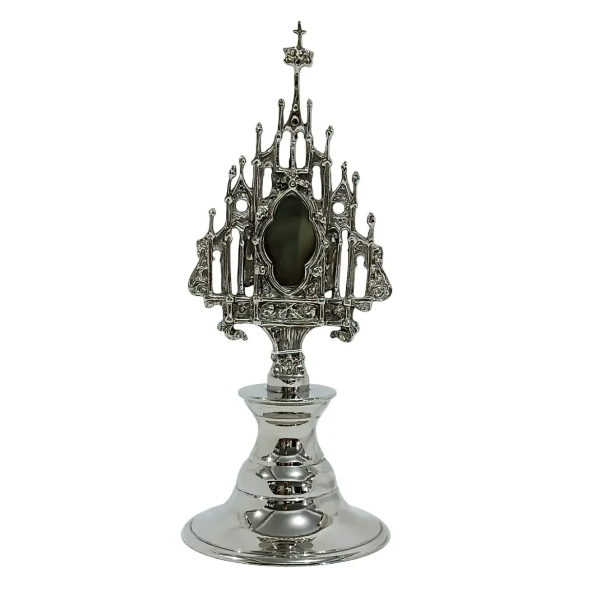 Este relicário apresenta um design inspirado no estilo gótico, com torres estilizados que elevam ao lado e acima do recipiente da relíquia. O Relicário Gótico é uma peça bem leve, o que facilita no momento de dar a benção com a relíquia.
