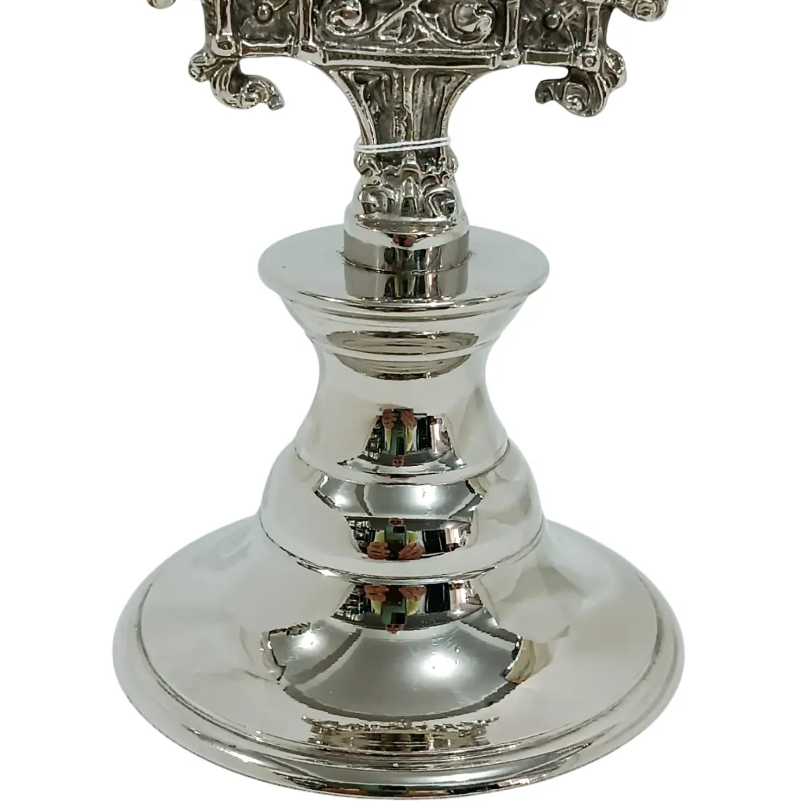 Este relicário apresenta um design inspirado no estilo gótico, com torres estilizados que elevam ao lado e acima do recipiente da relíquia. O Relicário Gótico é uma peça bem leve, o que facilita no momento de dar a benção com a relíquia.