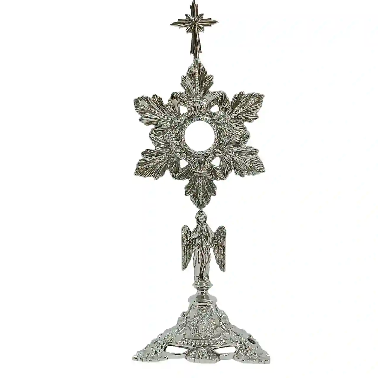 A peça possui um design clássico e elegante, destacando-se pela ornamentação e pela tonalidade prateada do níquel, ideal para exposição e veneração de relíquias sagradas.