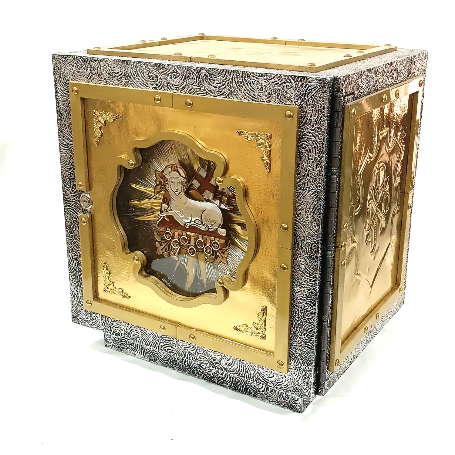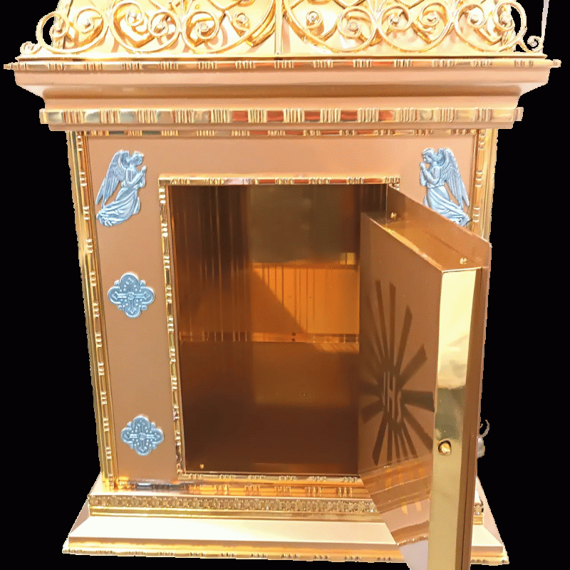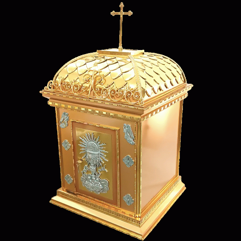 Belissímo sacrário em metal com luz indicadora da presença do Santíssimo