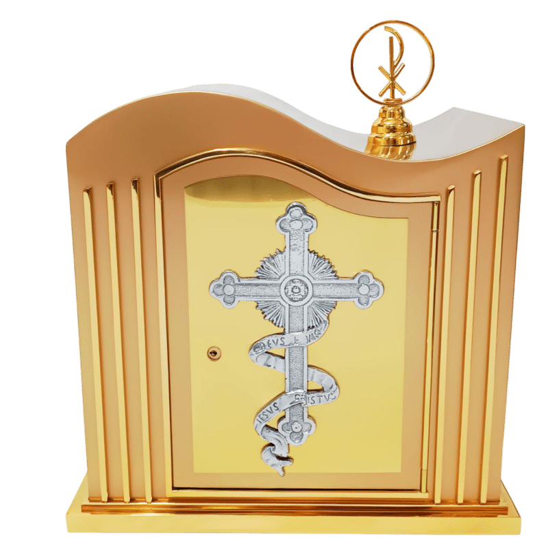 Características: Opção econômica, mais leve e acessível, com detalhe de uma barca com a cruz na porta para simbolizar a presença de Cristo pela Eucaristia. Protegido com verniz especial para maior durabilidade.