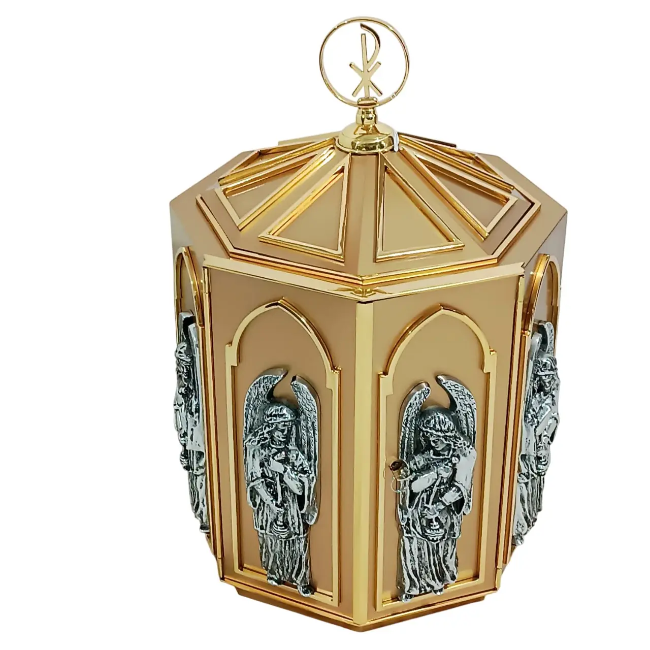 Sacrário Milan – produzido em metal de alta qualidade, com fino acabamento dourado. Possui design clássico e imponente, trazendo harmonia entre beleza e reverência para a guarda do Santíssimo Sacramento.