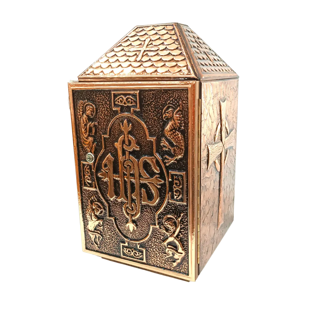 Sacrário produzido em madeira, com revestimento de metal. Interior também com revestimento de metal.
