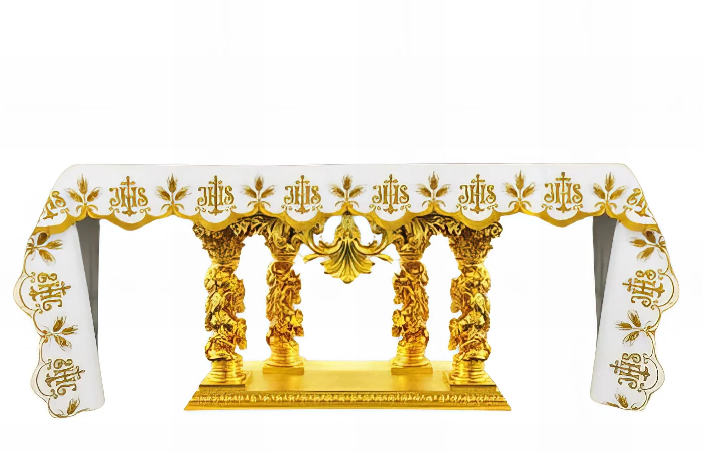 Toalha do altar com bordado de altíssima qualidade. A Toalha Bordada IHS Dourado é feita de poliéster superior e resistente a manchas, garantindo beleza e durabilidade para qualquer altar, seja ele de madeira ou de pedra.