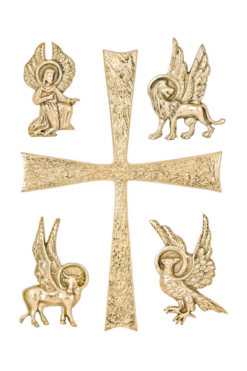 Aplique modelo Evangelistas com cruz, produzido em latão fundido, com acabamento especial em polimento e aplicação em verniz. Indicado para altar, mesa da palavra, pia batismal, sacrário, coluna (para sacrário e imagens), cofre, gazofilácio ou túmulos. Sua aplicação deve ser feita em superfícies de madeira ou pedra. A peça vem com furos e acompanha parafusos sem cabeça, após a marcação no local, furar e parafusar, aplicando cola de silicone PU nas extremidades.