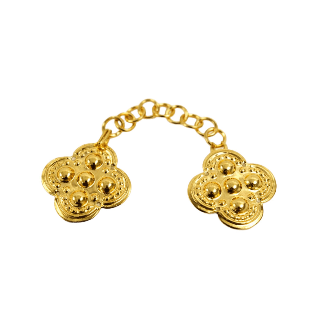 Alamar confeccionado em metal de alta qualidade, com acabamento dourado polido, ideal para aplicação em capas pluviais, dalmáticas, casulas e demais paramentos litúrgicos.