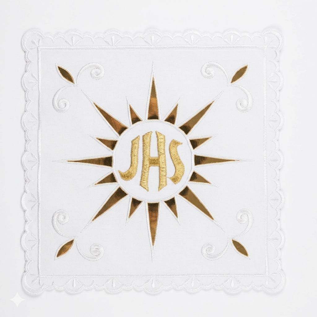 Purificador e toalha confeccionados em tecido de algodão branco neve, muito bem absorvente de água, 100% algodão. Pala e corporal confeccionados com tecido resistente a manchas. Pala com bordado vazado e reforço dourado no interior. 01 PALA EM Poliéster 100% – Tamanho 19 X 19 –
