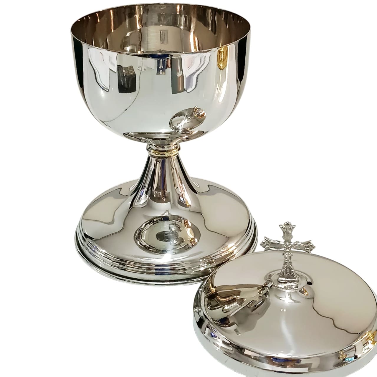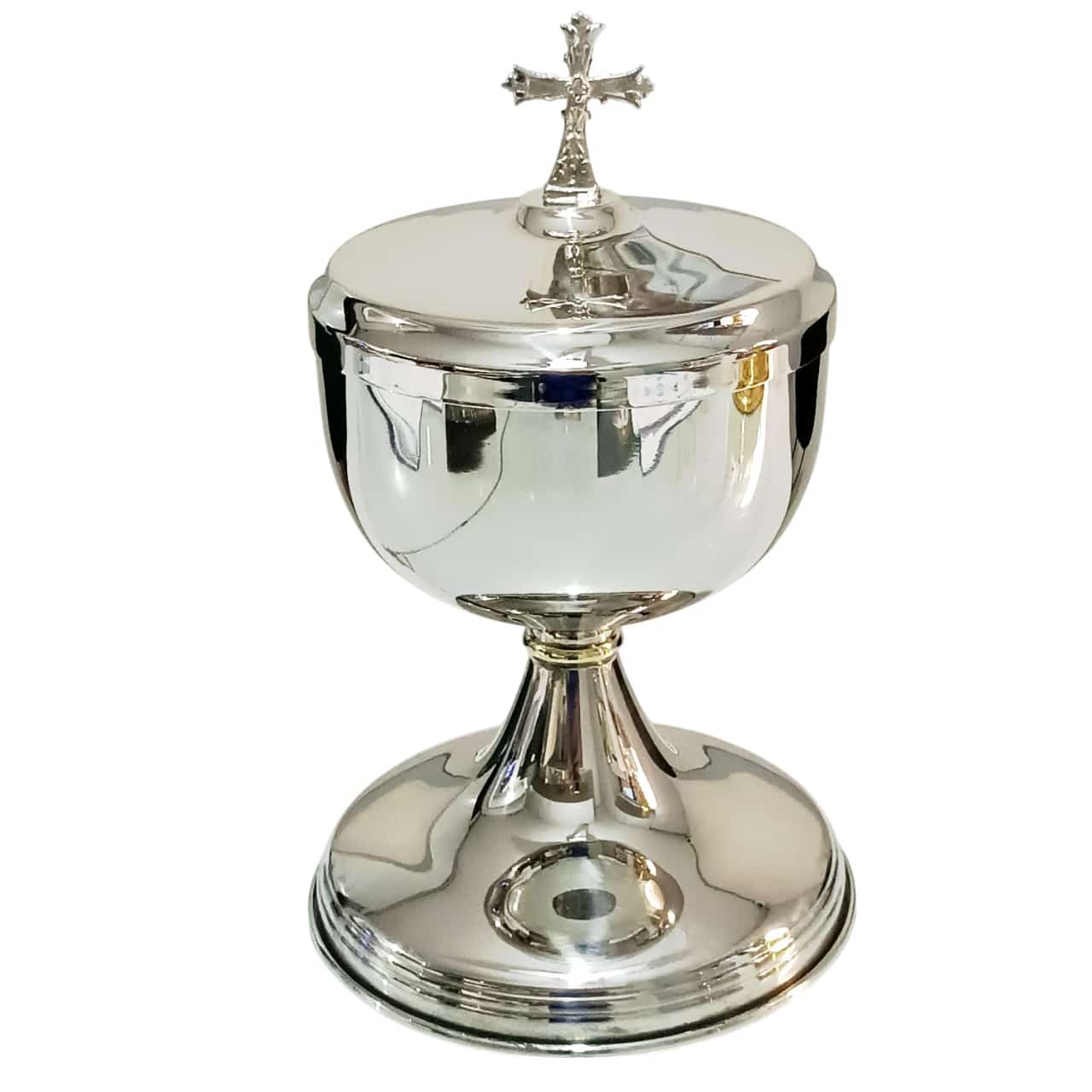 Possui capacidade aproximada para 500 partículas de 3,3 cm da Fábrica de Hóstias Nossa Senhora de Fátima, sendo ideal para celebrações e para a reserva eucarística no sacrário. A tampa é encimada por uma cruz, conferindo dignidade e solenidade à peça. Combina beleza, tradição e qualidade no serviço litúrgico.