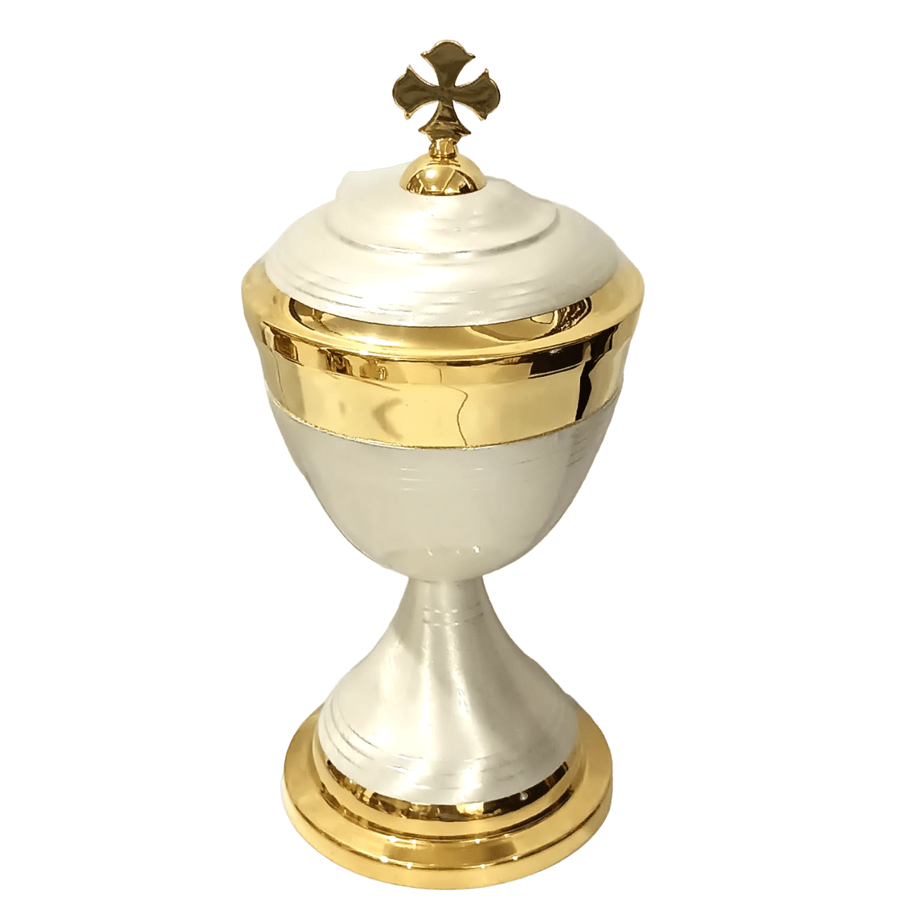 Âmbula litúrgica italiana, confeccionada em latão polido e banhada a ouro 24k. Esta peça se destaca pelo esmalte branco que a embeleza e pela cruz delicadamente inserida na tampa, agregando um toque de reverência e elegância. Uma preciosidade em estilo moderno e único.