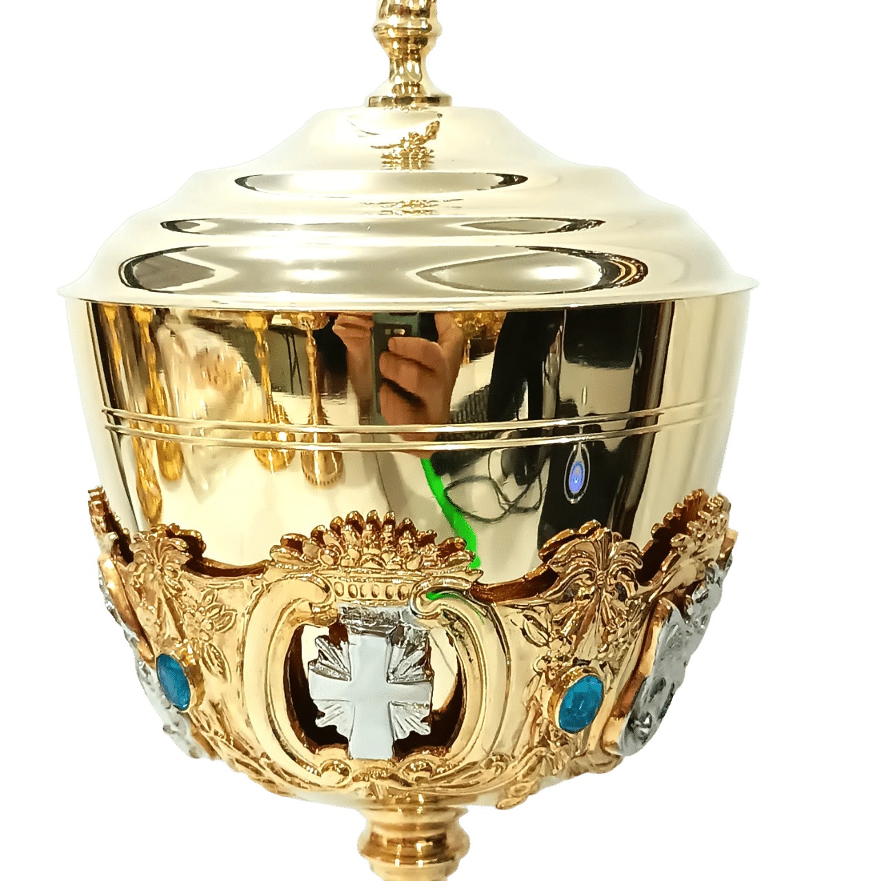 Âmbula neo clássica, banhada a ouro 24k, com pedraria azul. Figura dos 4 evangelistas no bojo e na base a cruz.