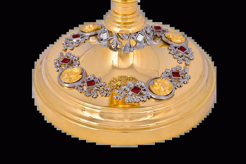 Âmbula 816/3 Pedras Vermelhas. Produzido em liga metálica com banho dourado e detalhes niquelados fundidos em cera perdida. Detalhe: pedras sintéticas vermelhas e apliques dos quatro evangelistas aplicados à peça. Capacidade 200 partículas.