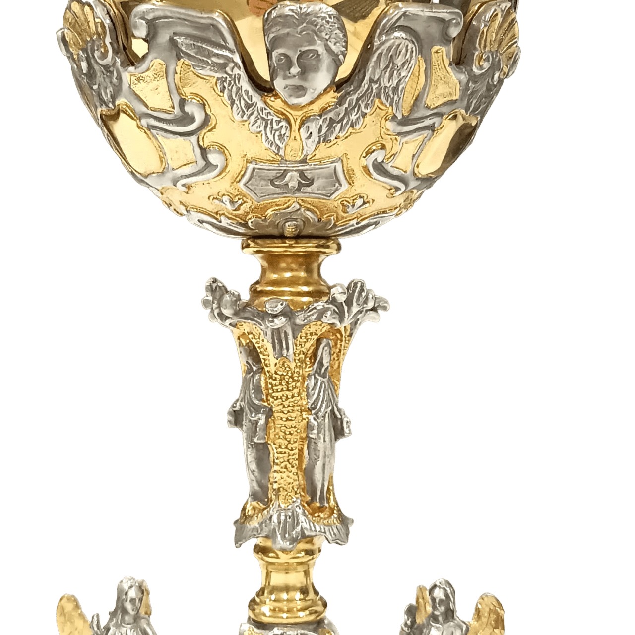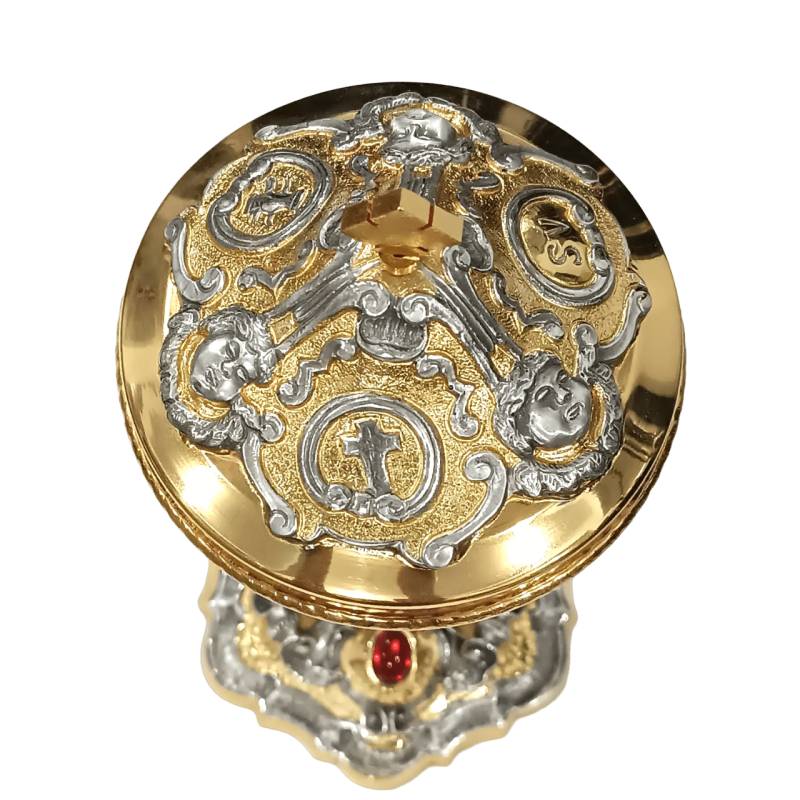 Âmbula fabricada no sistema de cera perdida, em latão com banho de ouro e prata. Rica em detalhes, sobresai os dois anjos anunciadores e as grandes pedras vermelhas vivo.