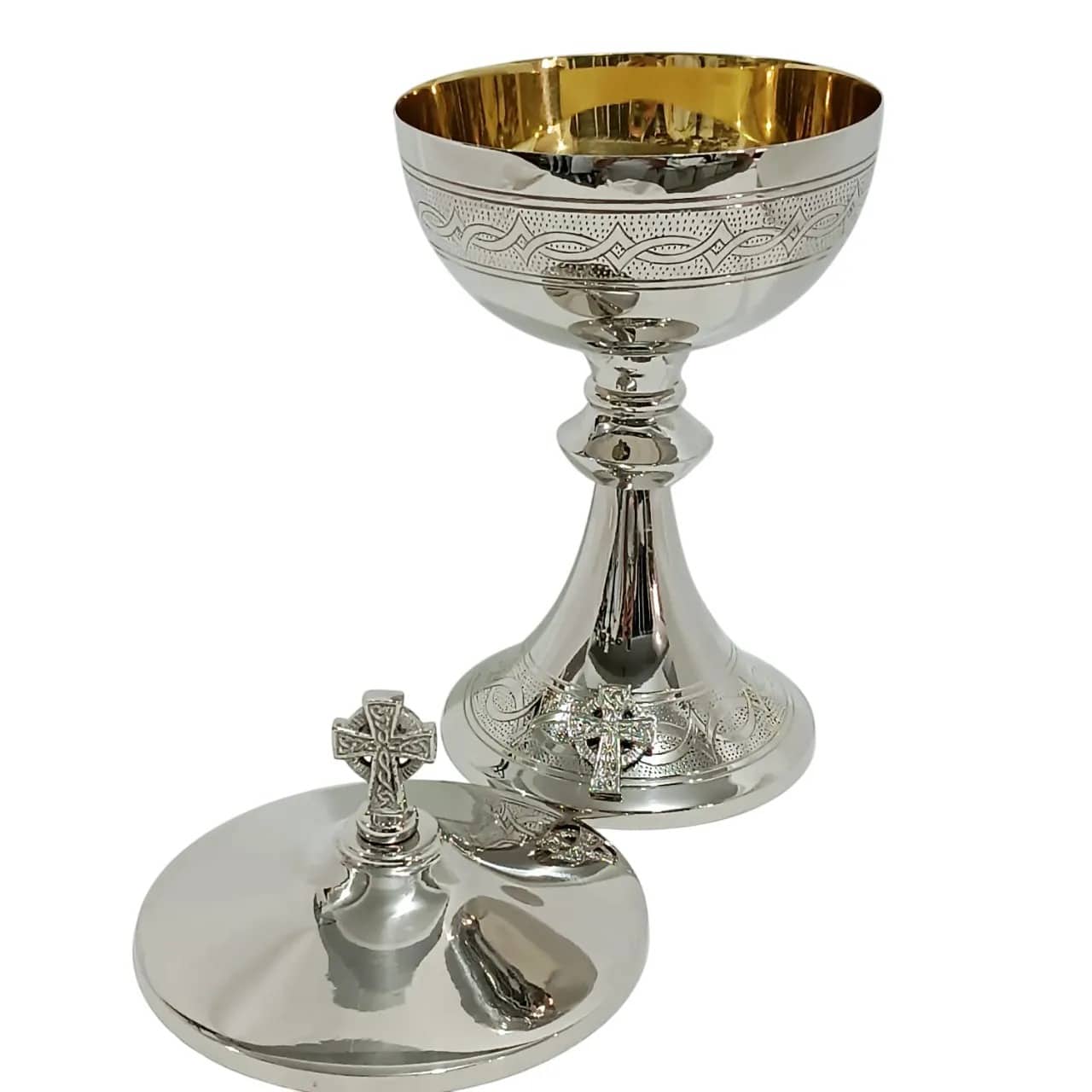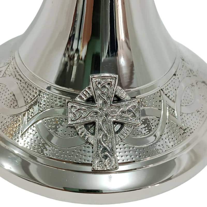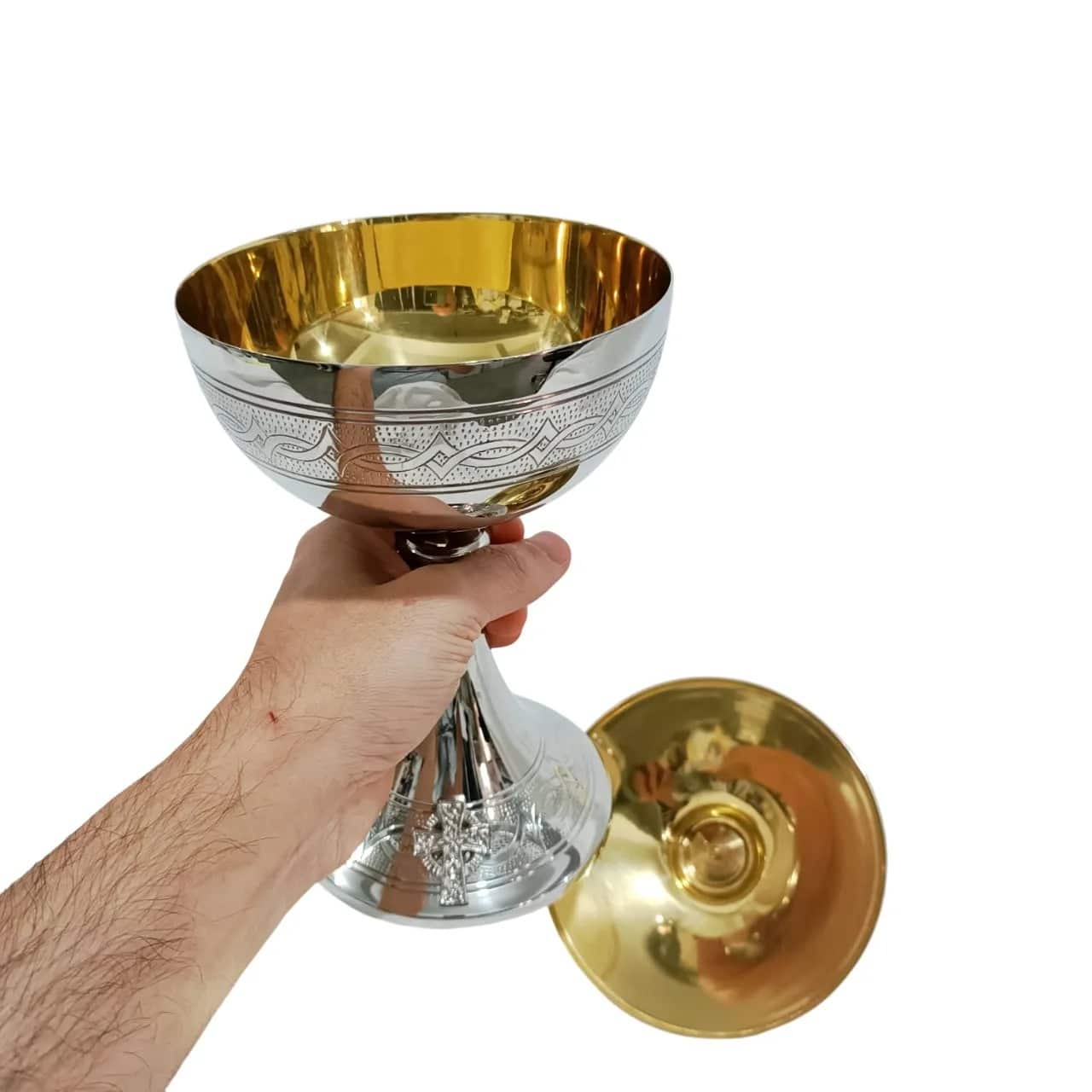 Âmbula italiana “Coroa de Espinhos”, produzido em latão fundido com banho de níquel e interior dourado. A peça apresenta rico entalhe decorativo com motivo de coroa de espinhos e cruzes em relevo na base, unindo beleza, simbologia e resistência.
