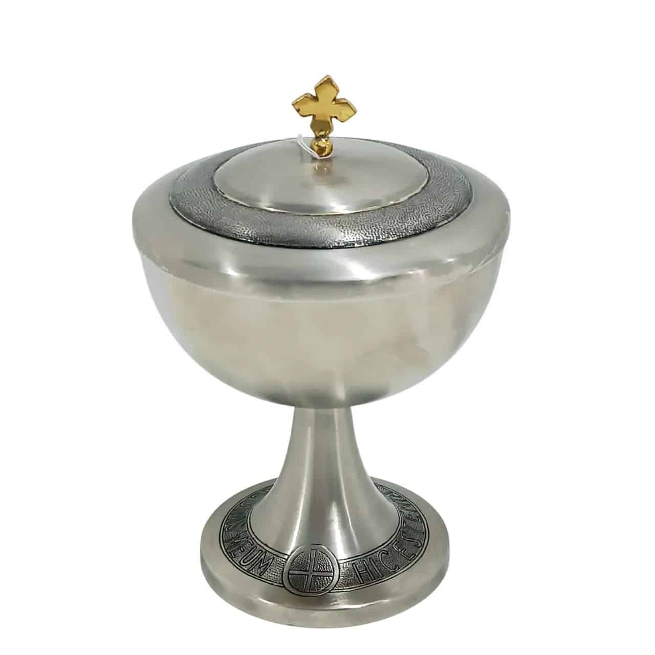 Âmbula litúrgico italiano “Corpus Meum”, confeccionada em metal fundido com banho de prata envelhecida e interior dourado.