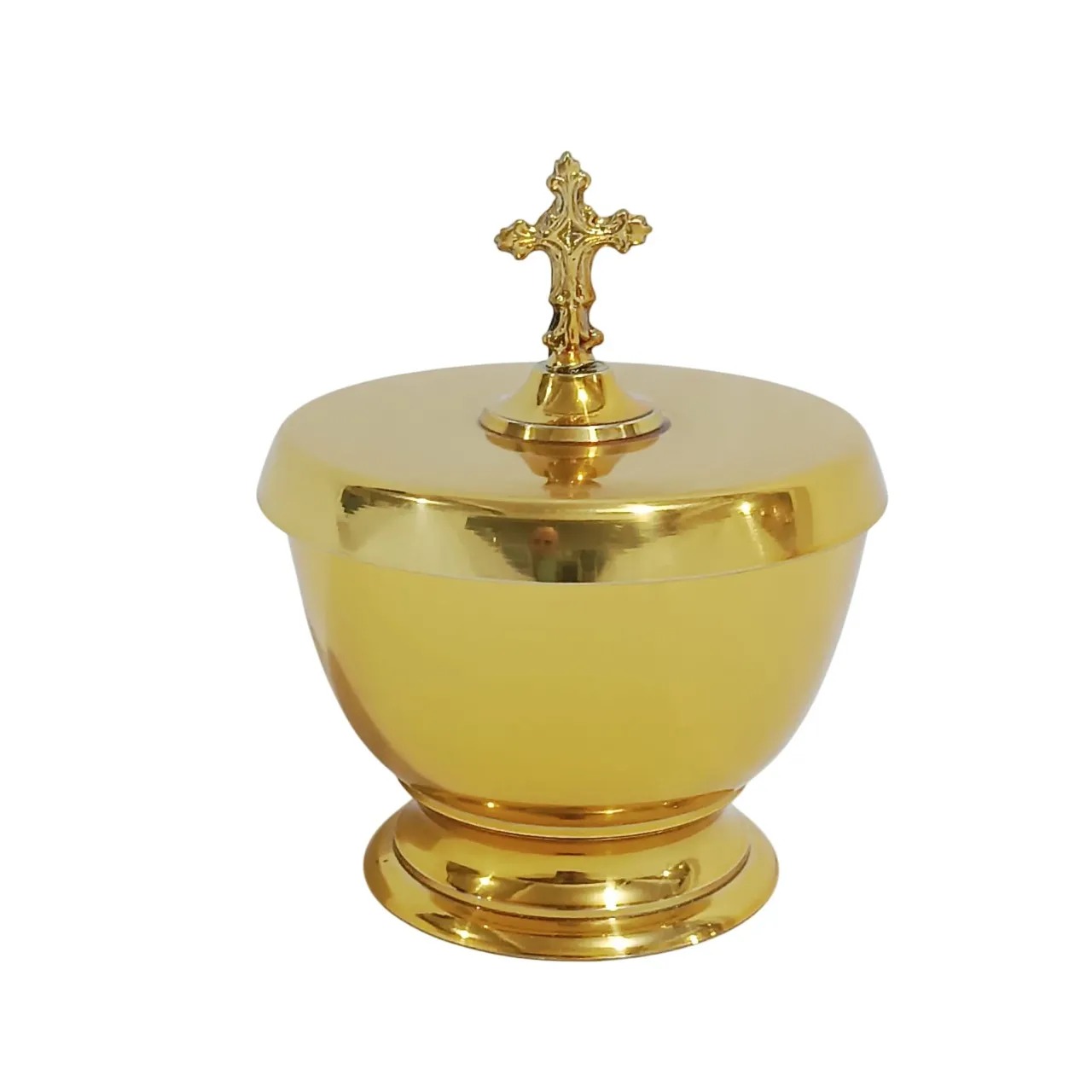O acabamento elegante e a cruz no topo da tampa ressaltam a tradição e a reverência próprias dos objetos litúrgicos, unindo beleza, simplicidade e utilidade.