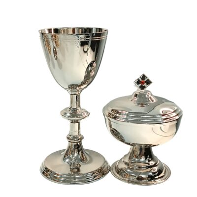 Conjunto de âmbula e cálice simples para celebrações diárias. Feito em latão e com banho de níquel, o Cálice 1100 é perfeito para as celebrações diárias em pequenas comunidades e capelas. A âmbula suporta até 200 hóstias de 3,3cm.