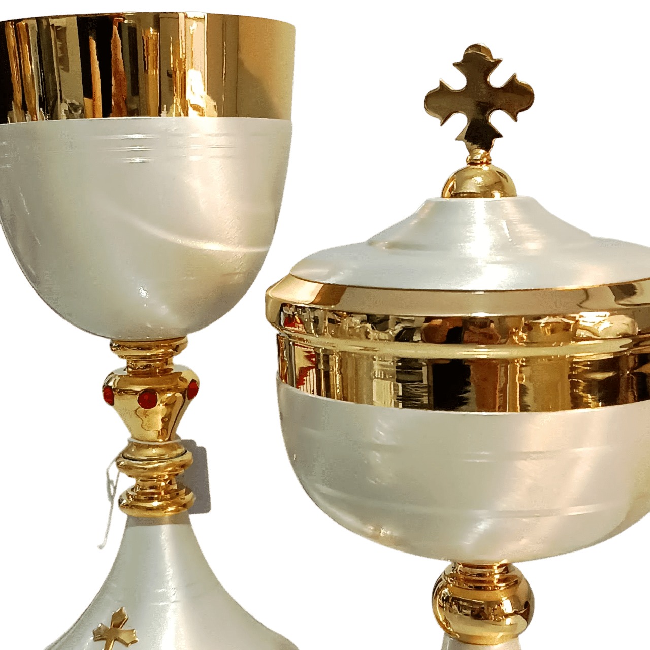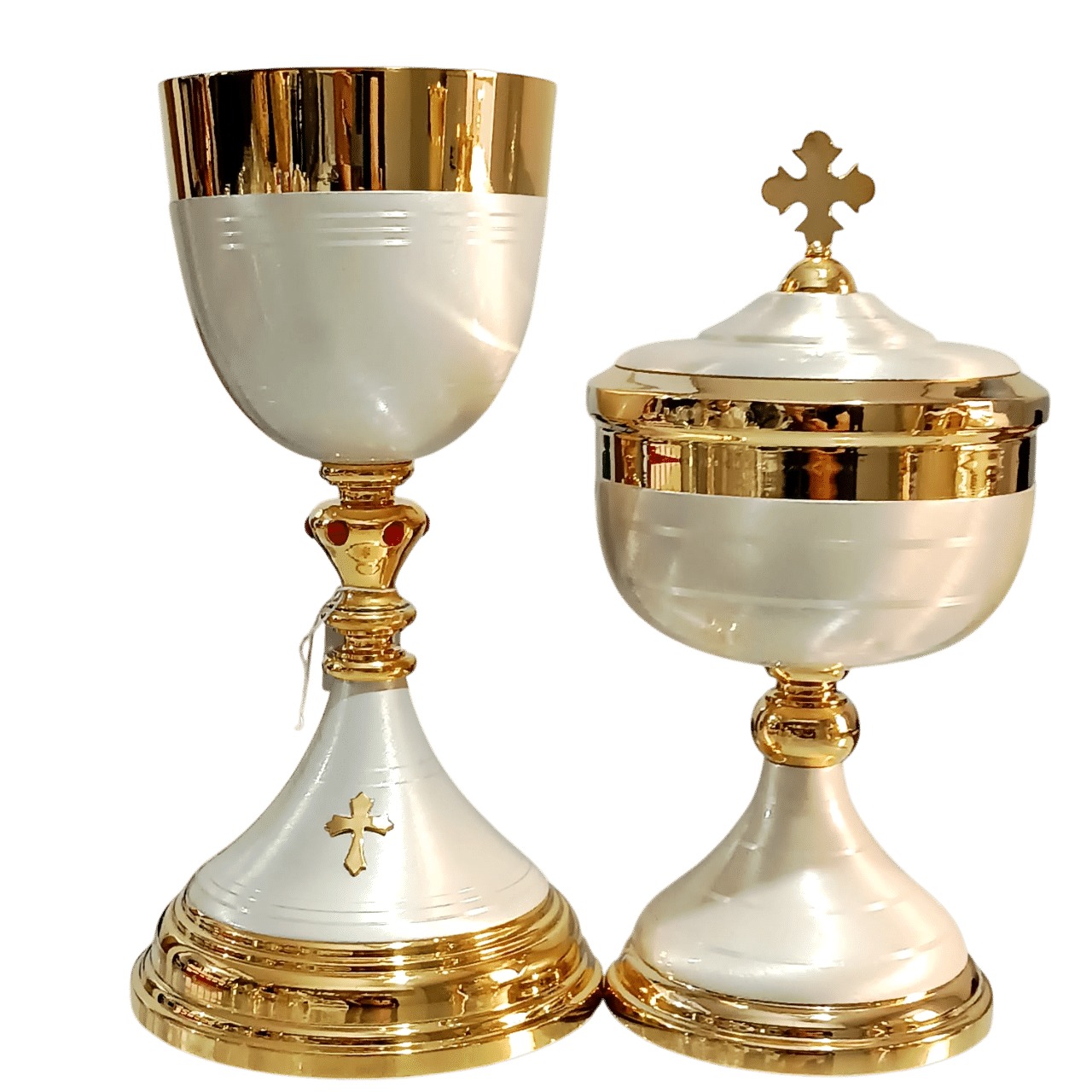 Âmbula e cálice litúrgicos italianos, confeccionados em latão polido e banhada a ouro 24k. Estas peças se destacam pelo esmalte branco que as embelezam e pela cruz delicadamente inserida na tampa da âmbula e na base do cálice, agregando um toque de reverência e elegância. Uma preciosidade em estilo moderno e único.