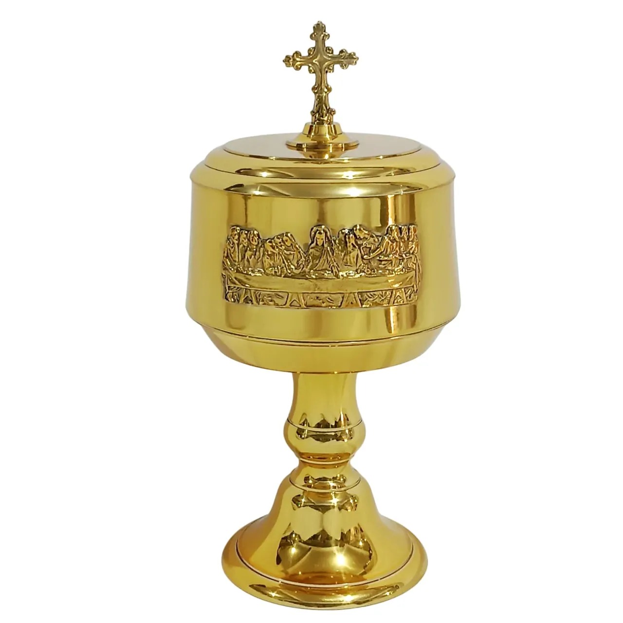 Âmbula confeccionada em estanho de alta qualidade, com banho especial de longa duração, que garante até 10 anos de garantia contra desgaste. A peça apresenta design refinado, com aplicação em relevo da Santa Ceia ao redor do corpo, símbolo profundo da Eucaristia.