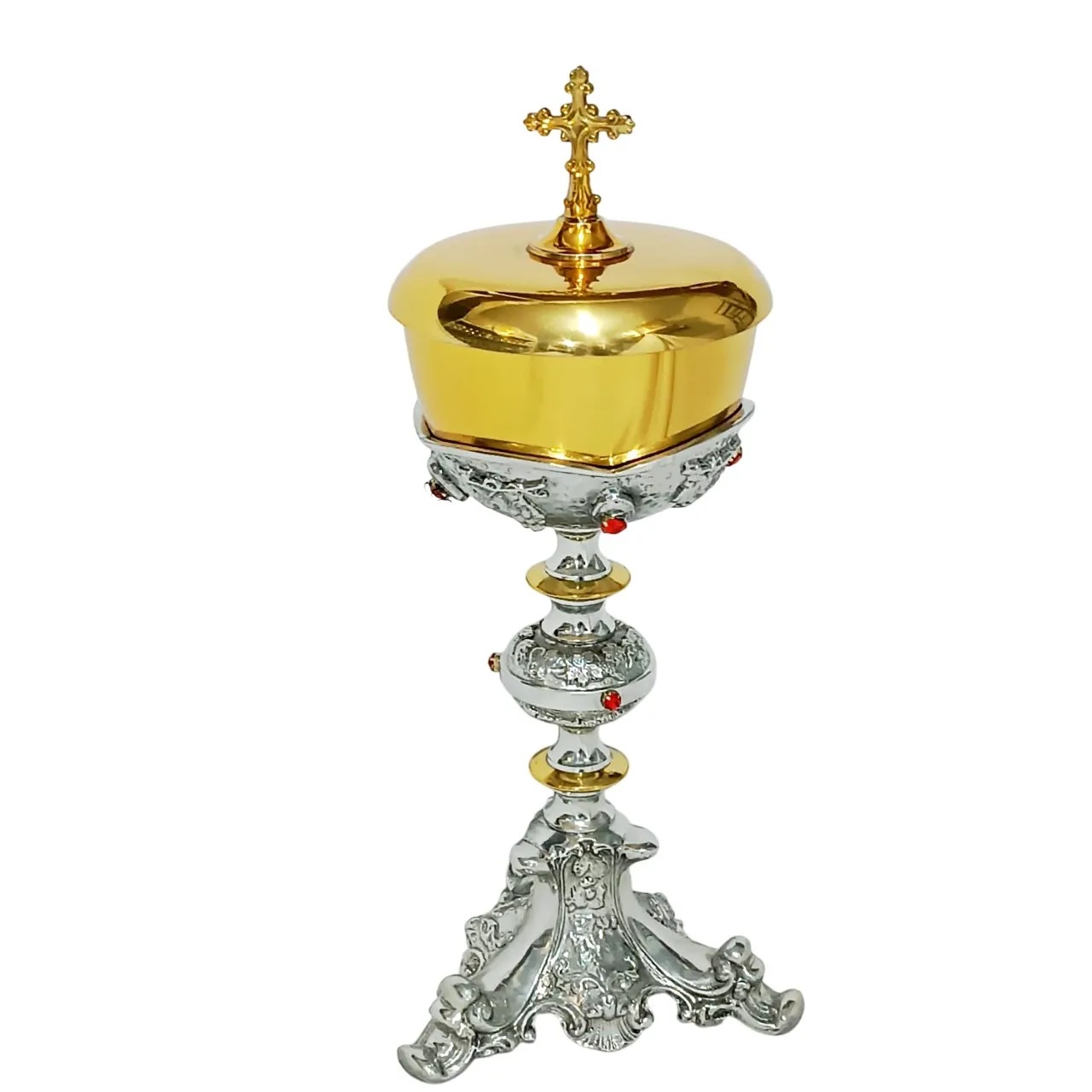 Descrição: A Âmbula F545-1 é uma obra de arte em metal nobre, projetado para elevar a solenidade das celebrações litúrgicas. Fabricado em estanho, um material reconhecido por sua resistência e beleza incomparável. A âmbula F335-1 possui um design imponente, com detalhes trabalhados em todo o corpo, desde a base até o bojo. Seu acabamento em duas tonalidades adiciona uma camada extra de sofisticação.