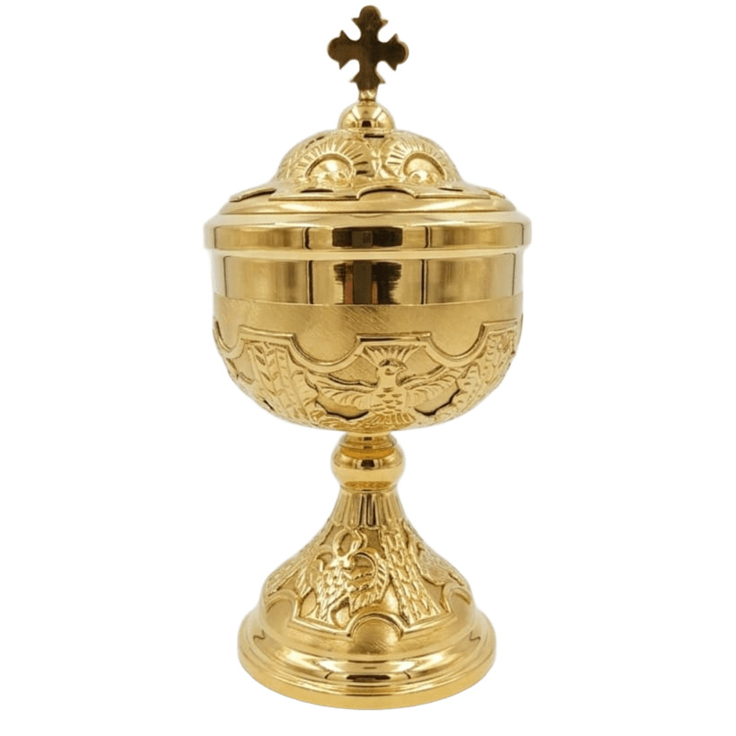 O corpo da peça possui delicadas gravações em relevo, que enriquecem o visual e destacam a tradição do artesanato litúrgico. A tampa é finalizada com uma cruz ornamental, símbolo da fé cristã e elemento que confere ainda mais solenidade ao conjunto.