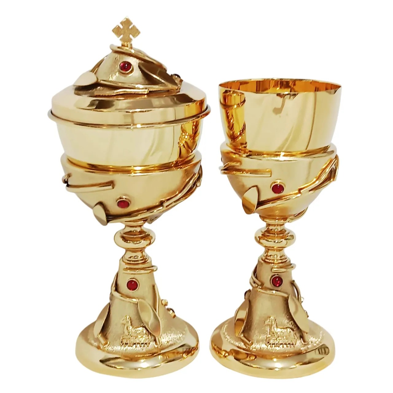 Âmbula e Cálice litúrgicos confeccionados na Itália, com design refinado em estilo contemporâneo. Possui detalhes em relevo com ramos de oliveira e aplicação de pedras vermelhas, simbolizando a paz e o sacrifício de Cristo.