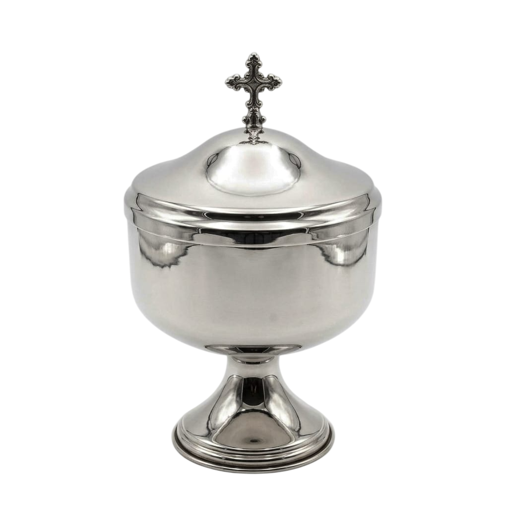 A Âmbula Nobre Níquel – M6972 é uma peça de grande elegância e dignidade, desenvolvida para a guarda das partículas consagradas com segurança e reverência. Seu acabamento em níquel confere um brilho sofisticado e discreto, ideal para ambientes litúrgicos que valorizam a sobriedade aliada à beleza.