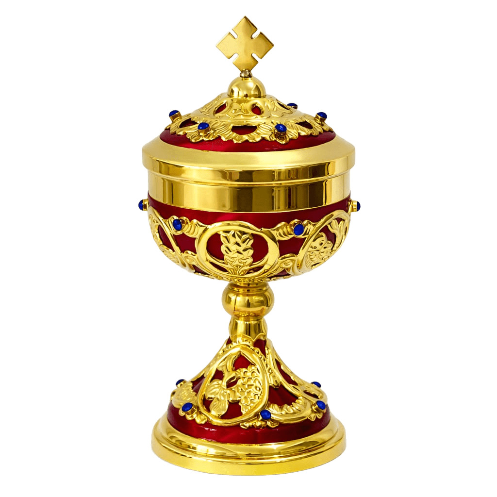 Ambula com acabamento dourado, tendo um fundo esmaltado vermelho. Um verdadeiro encanto
