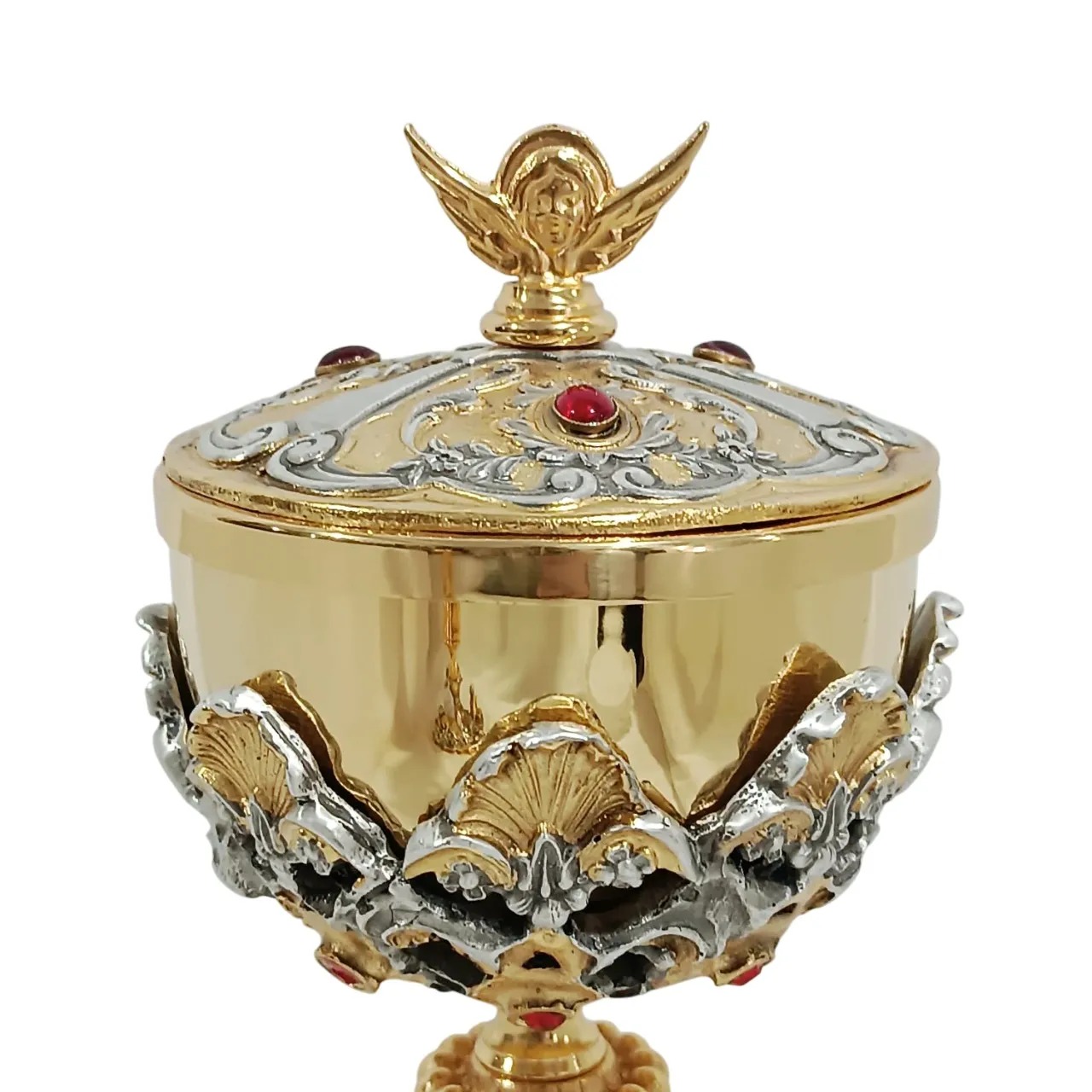 Âmbula italiana produzida em cera perdida, técnica artesanal que garante riqueza de detalhes e acabamento refinado. Peça em metal fundido, com banho bicolor – de prata envelhecida e em ouro 24k – conferindo nobreza e resistência ao uso litúrgico.