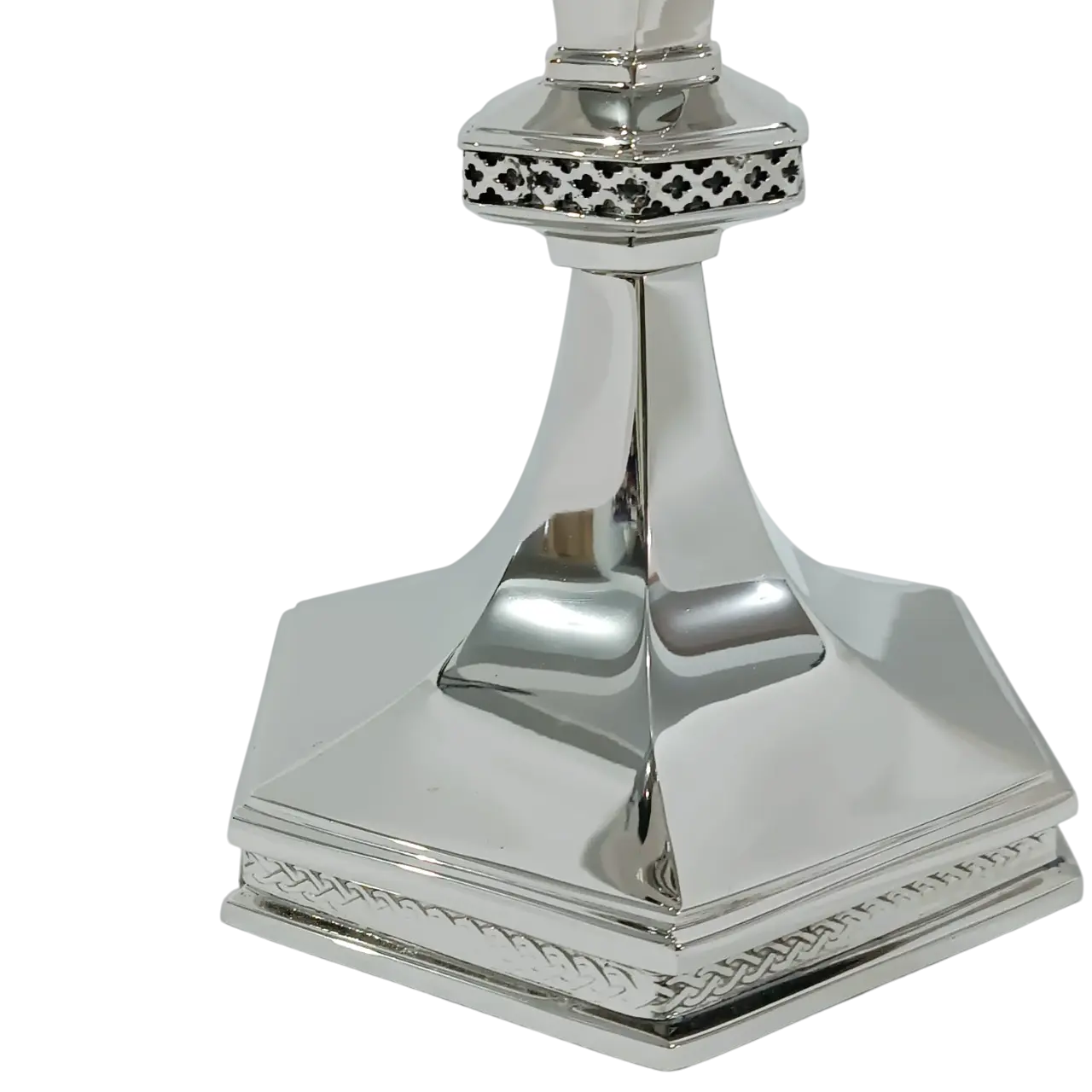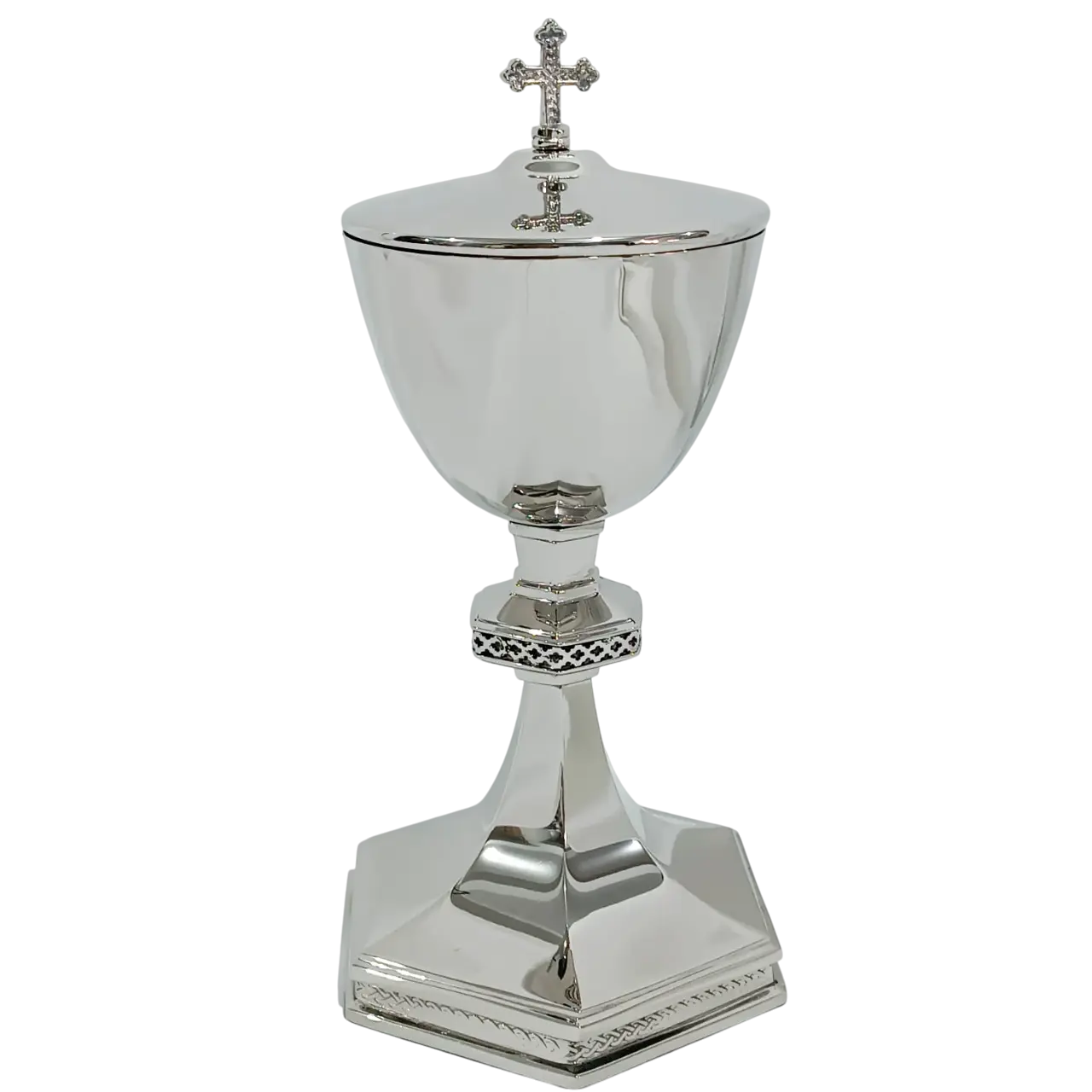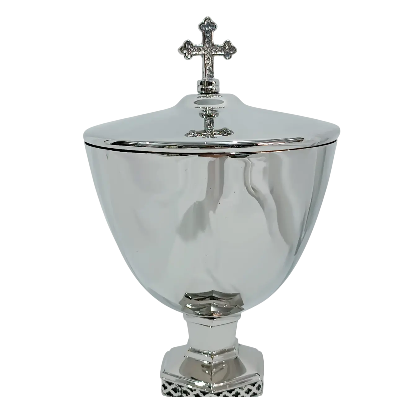 Elegante âmbula confeccionada em latão com fino banho de níquel e interior dourado. Possue base hexagonal com detalhes decorativos e acabamento de alto brilho. A âmbula acompanha tampa com cruz no topo.